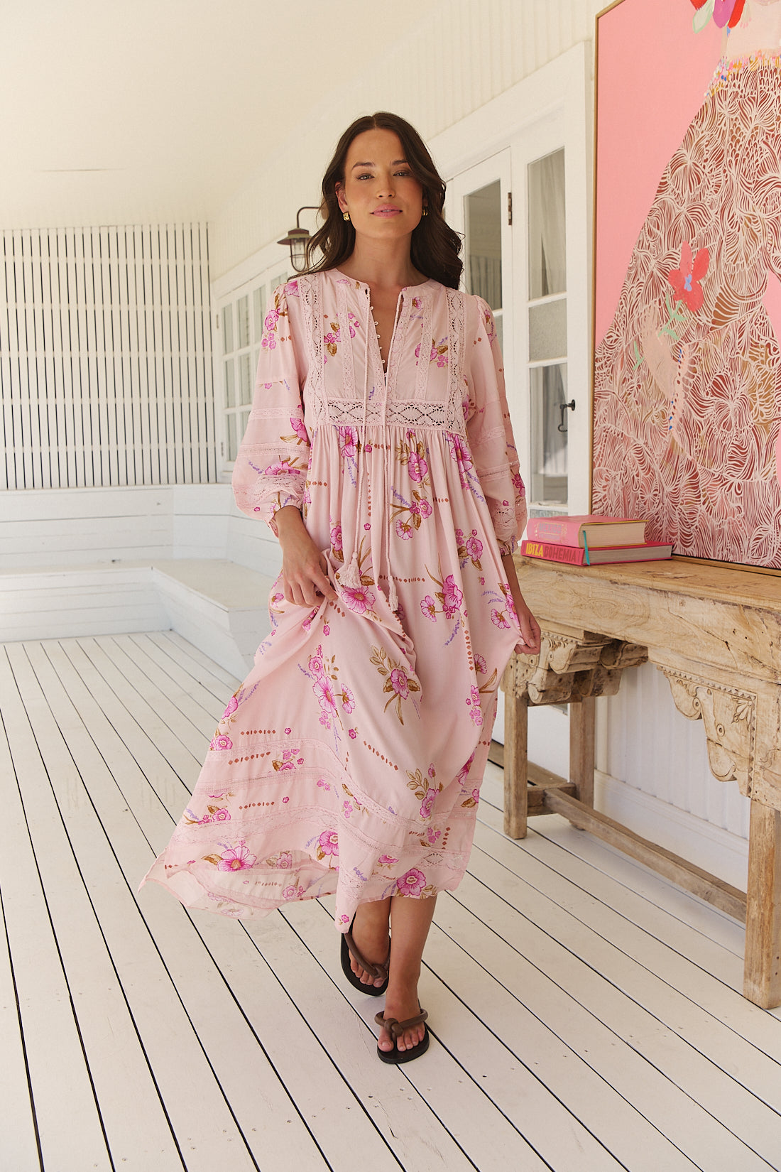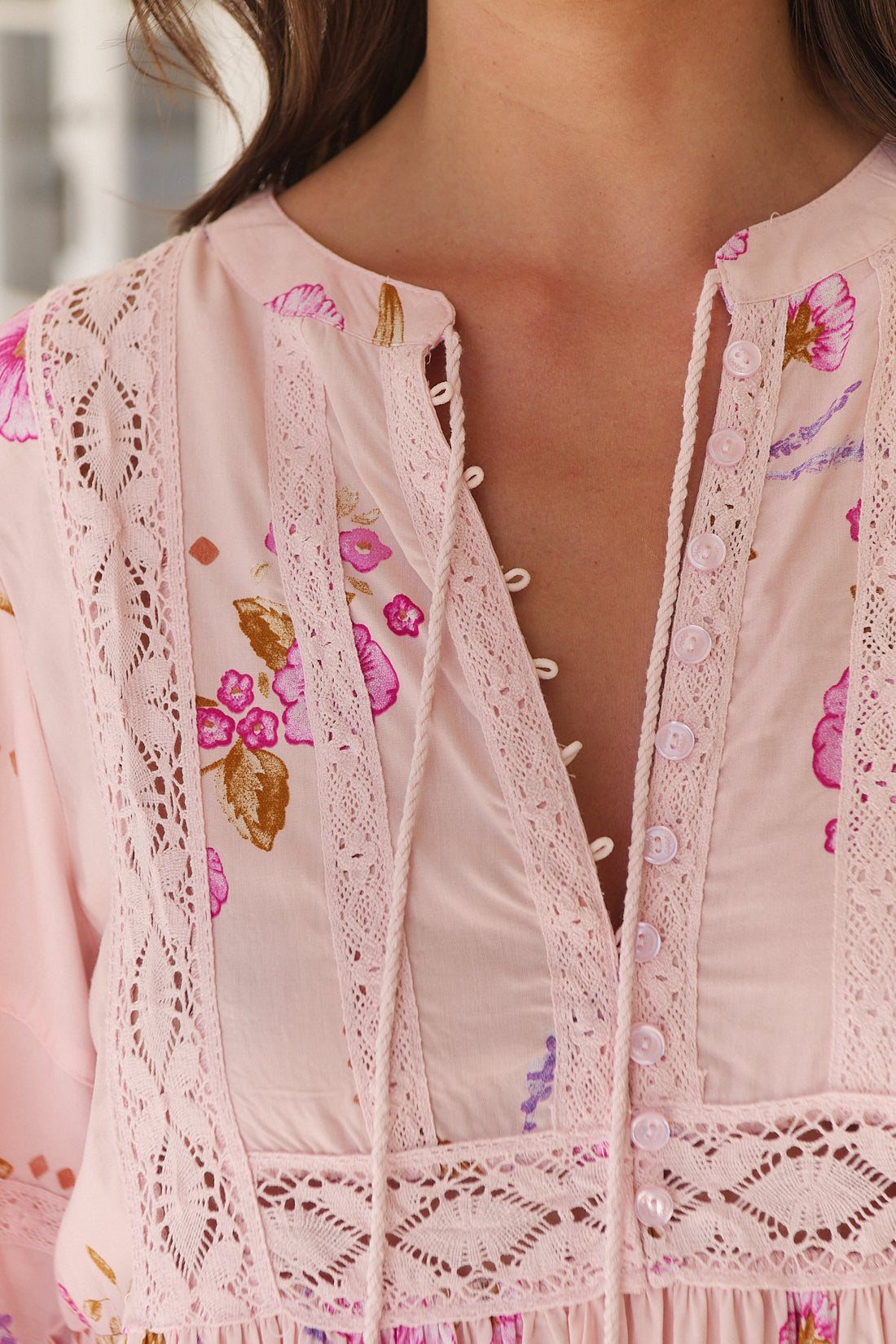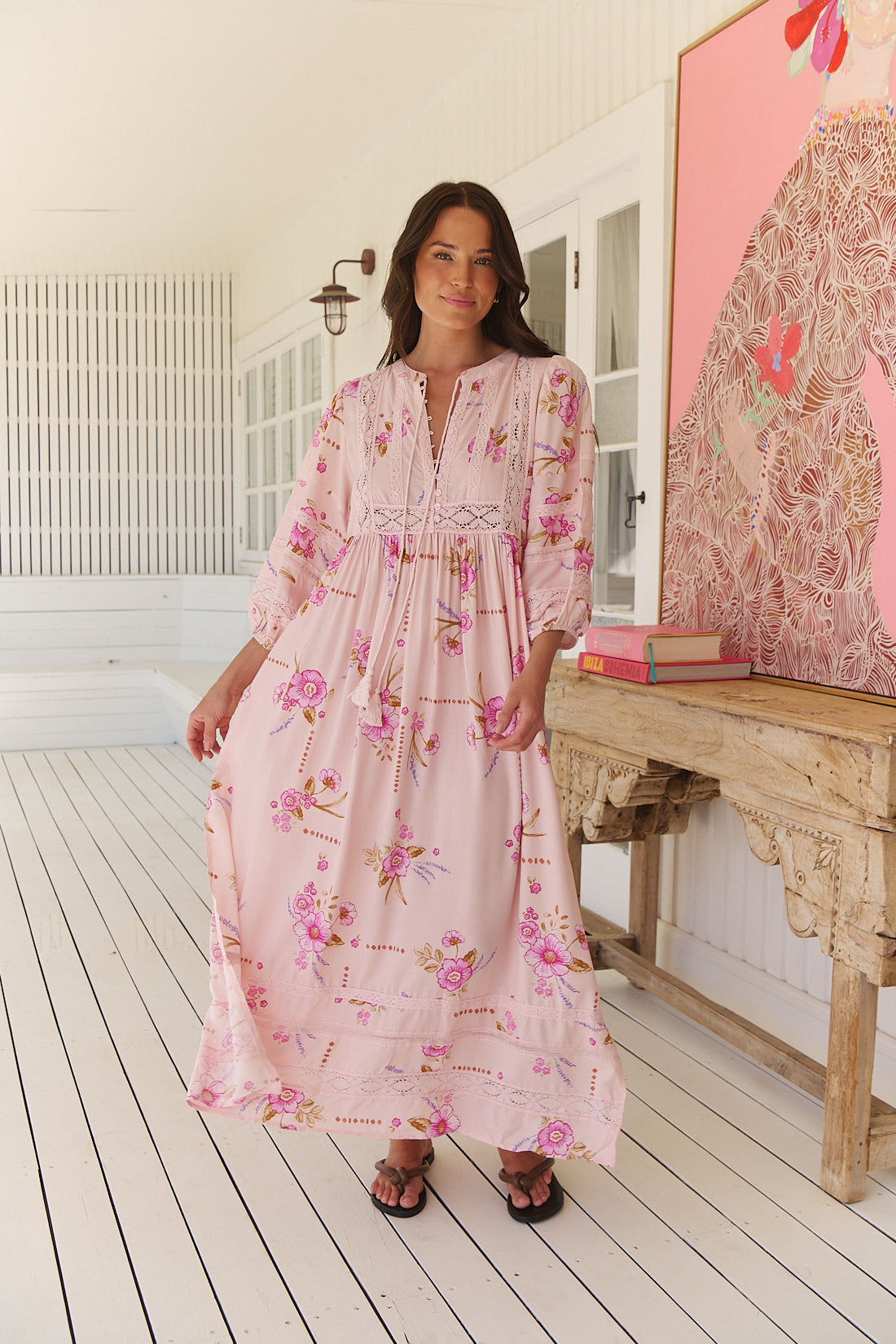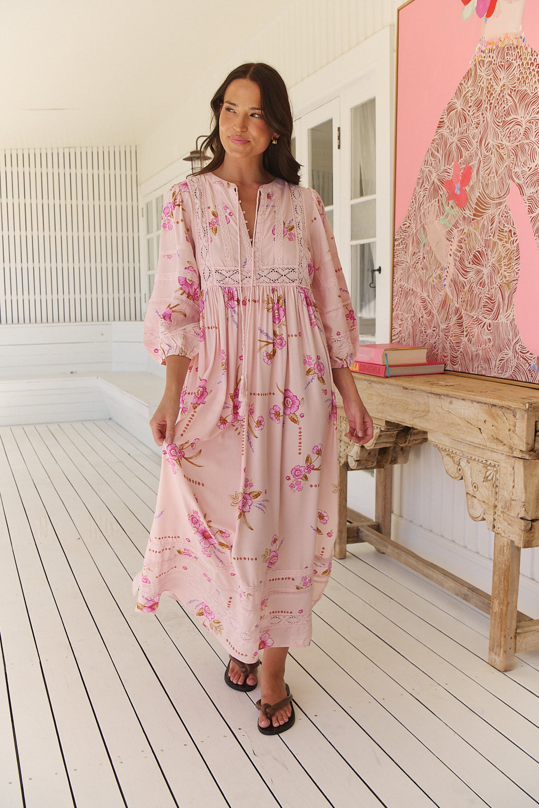 Jaase Meadow Maxi Dress with V Neck Button Bodice - Blushing Fields