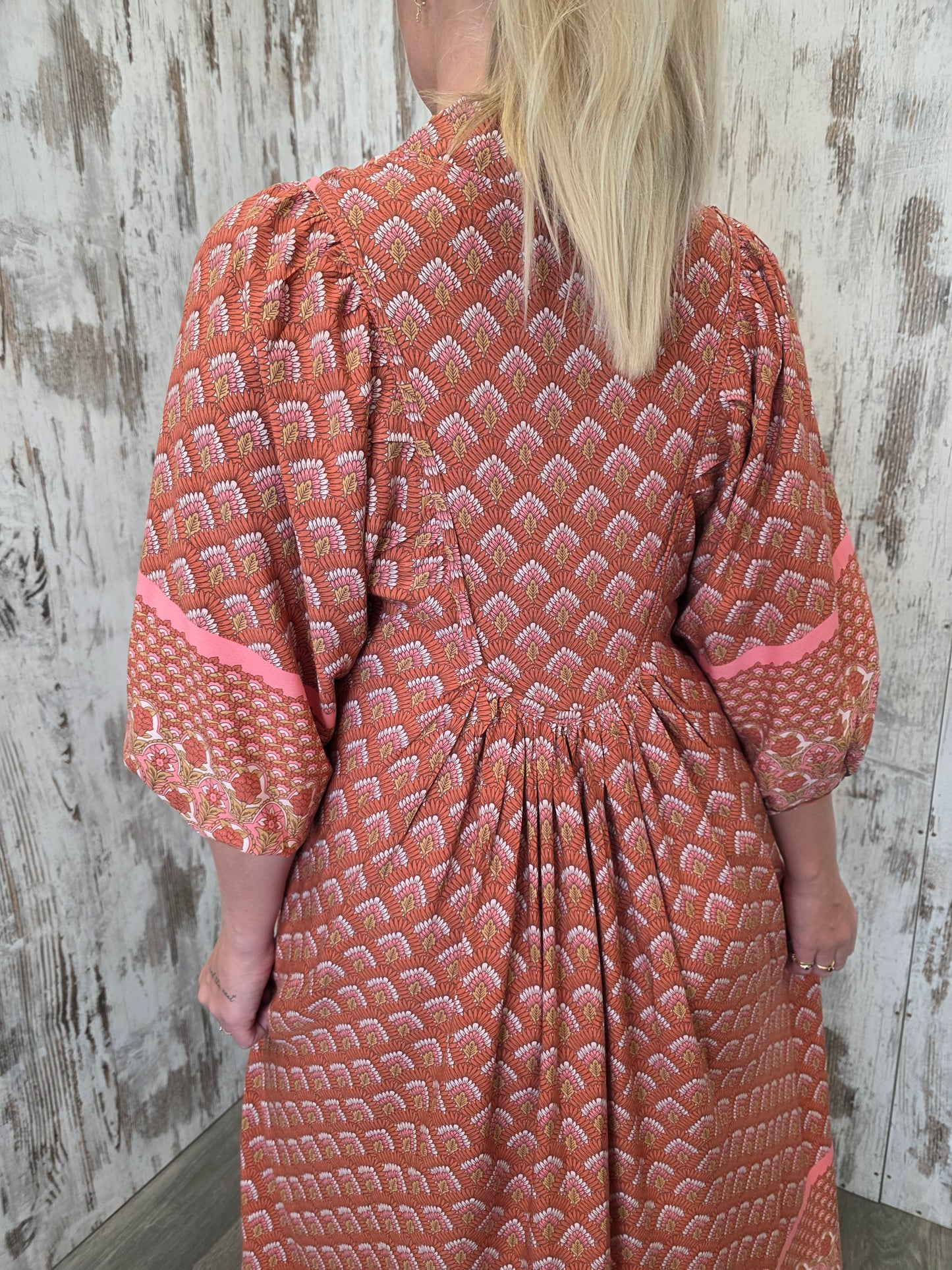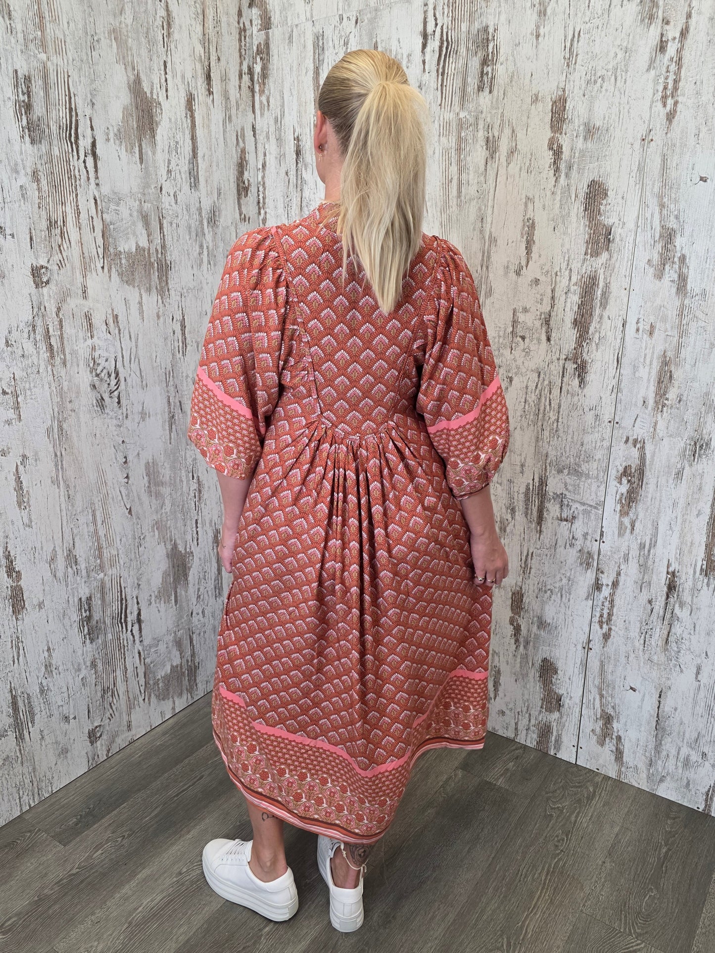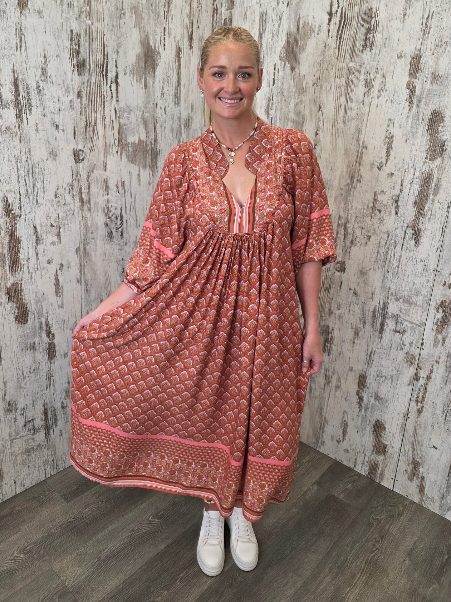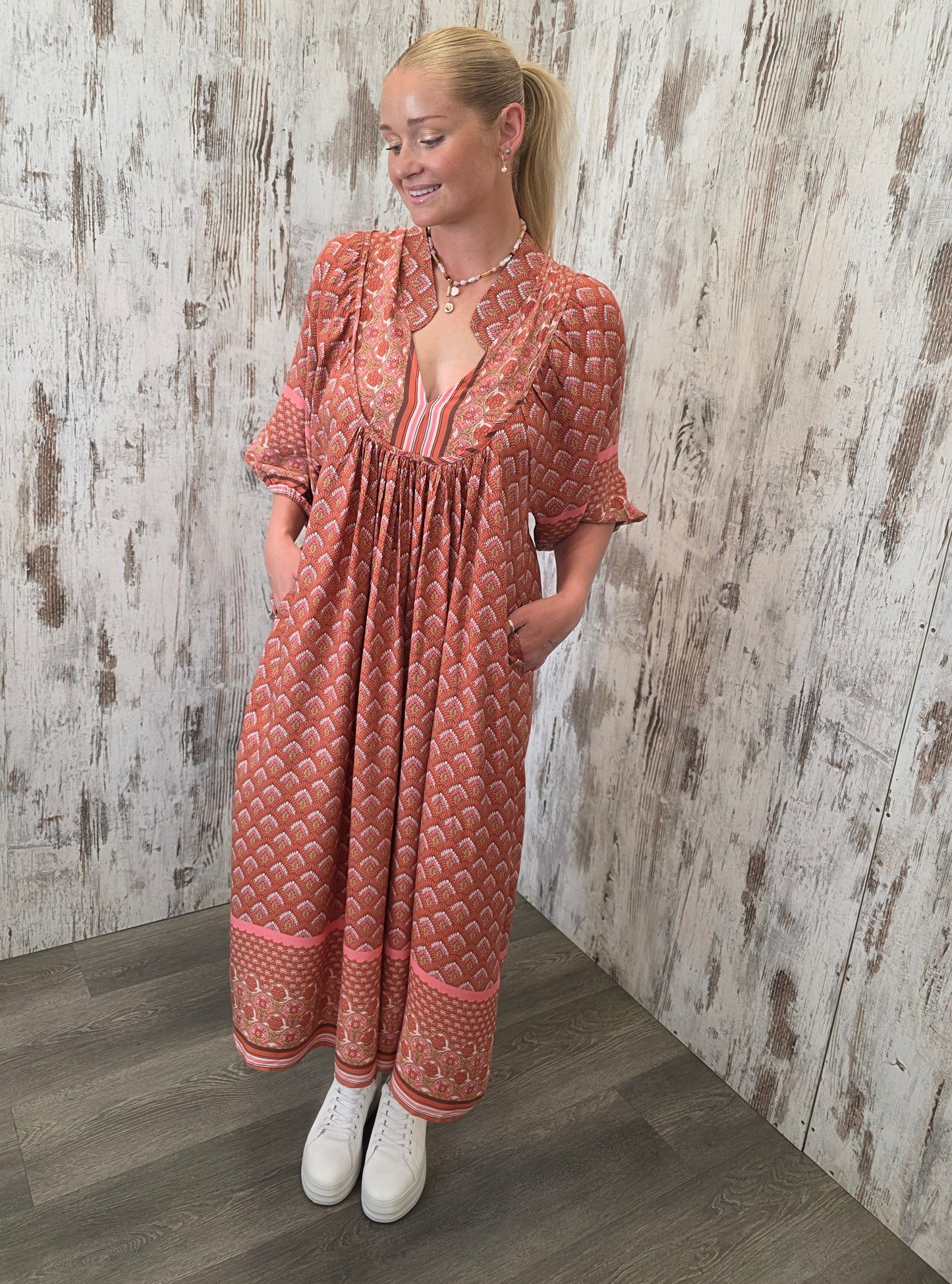 Jaase Boheme Midi Dress with Billowy Sleeve V-Neck Pockets - Coral Eden