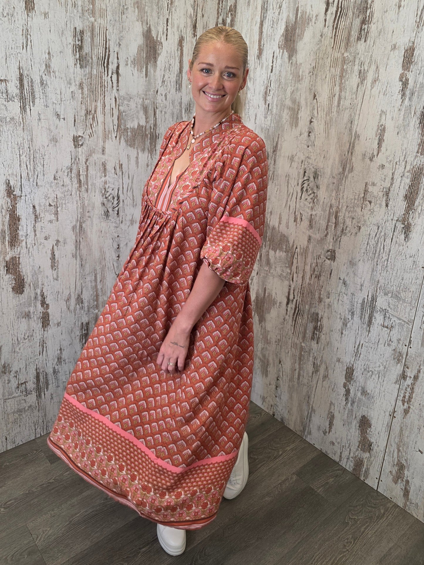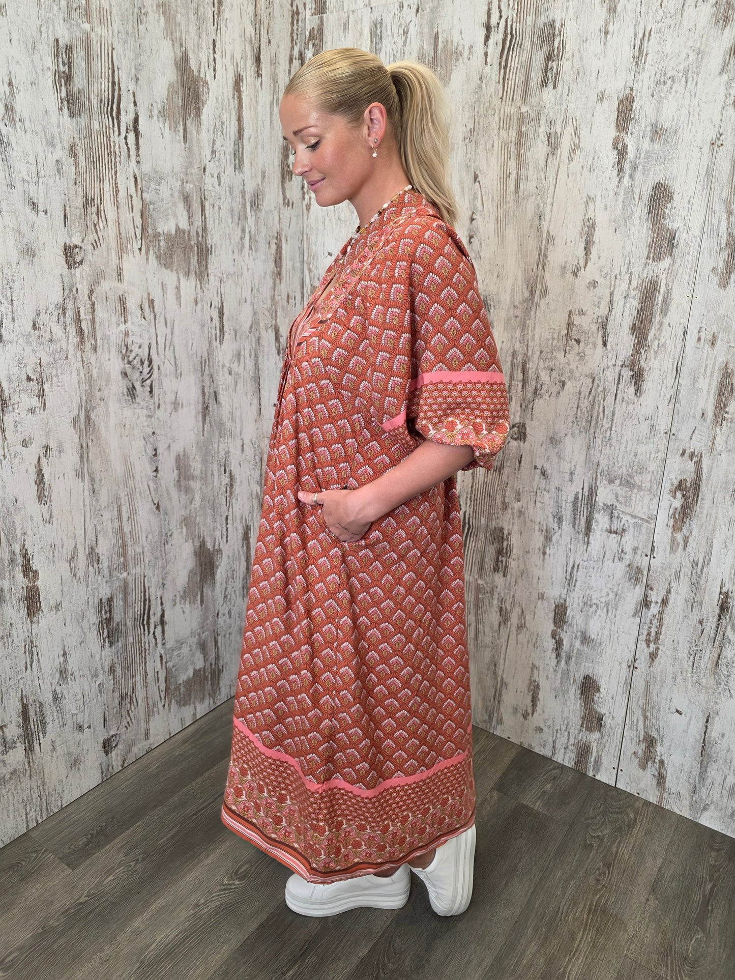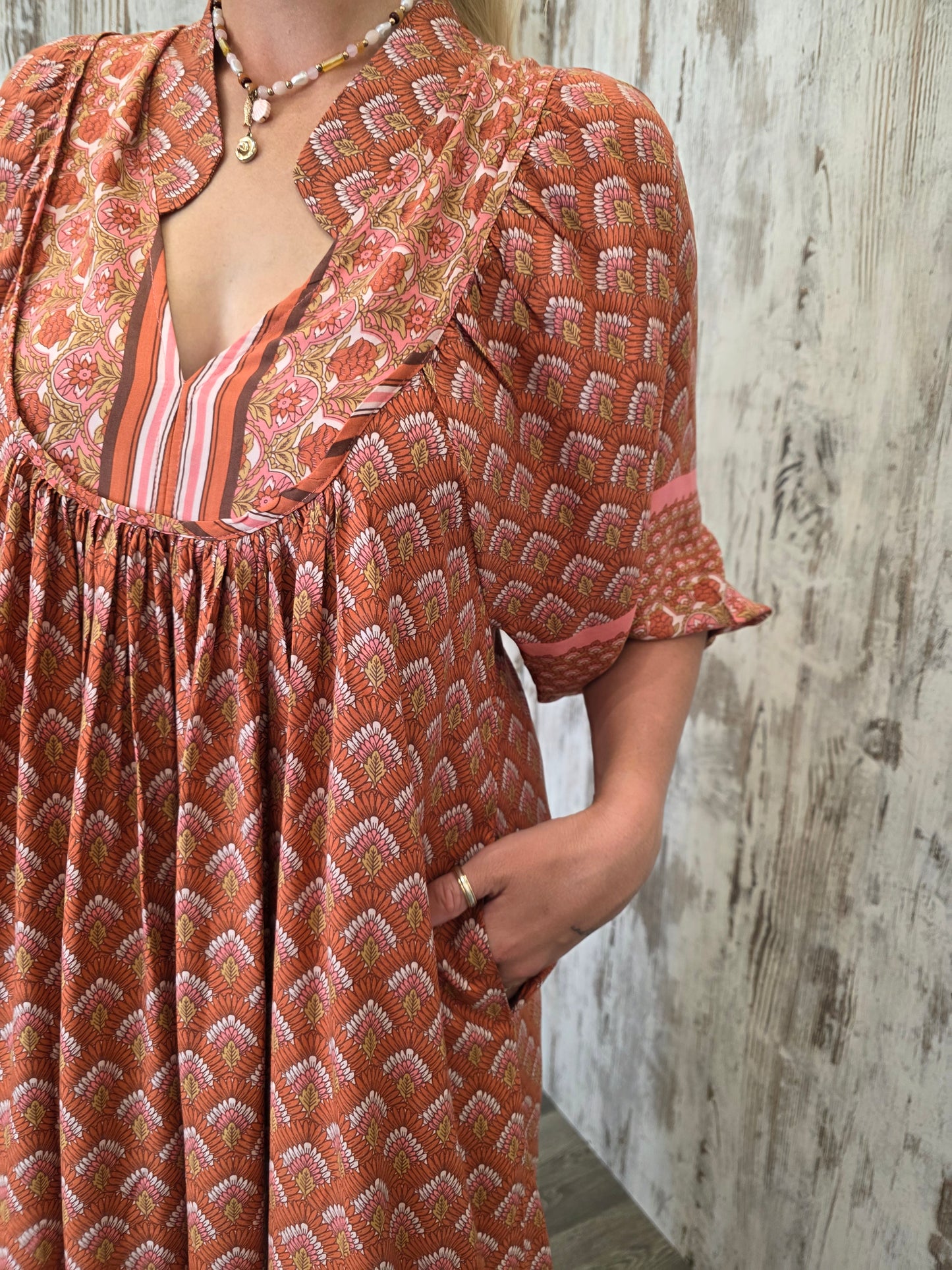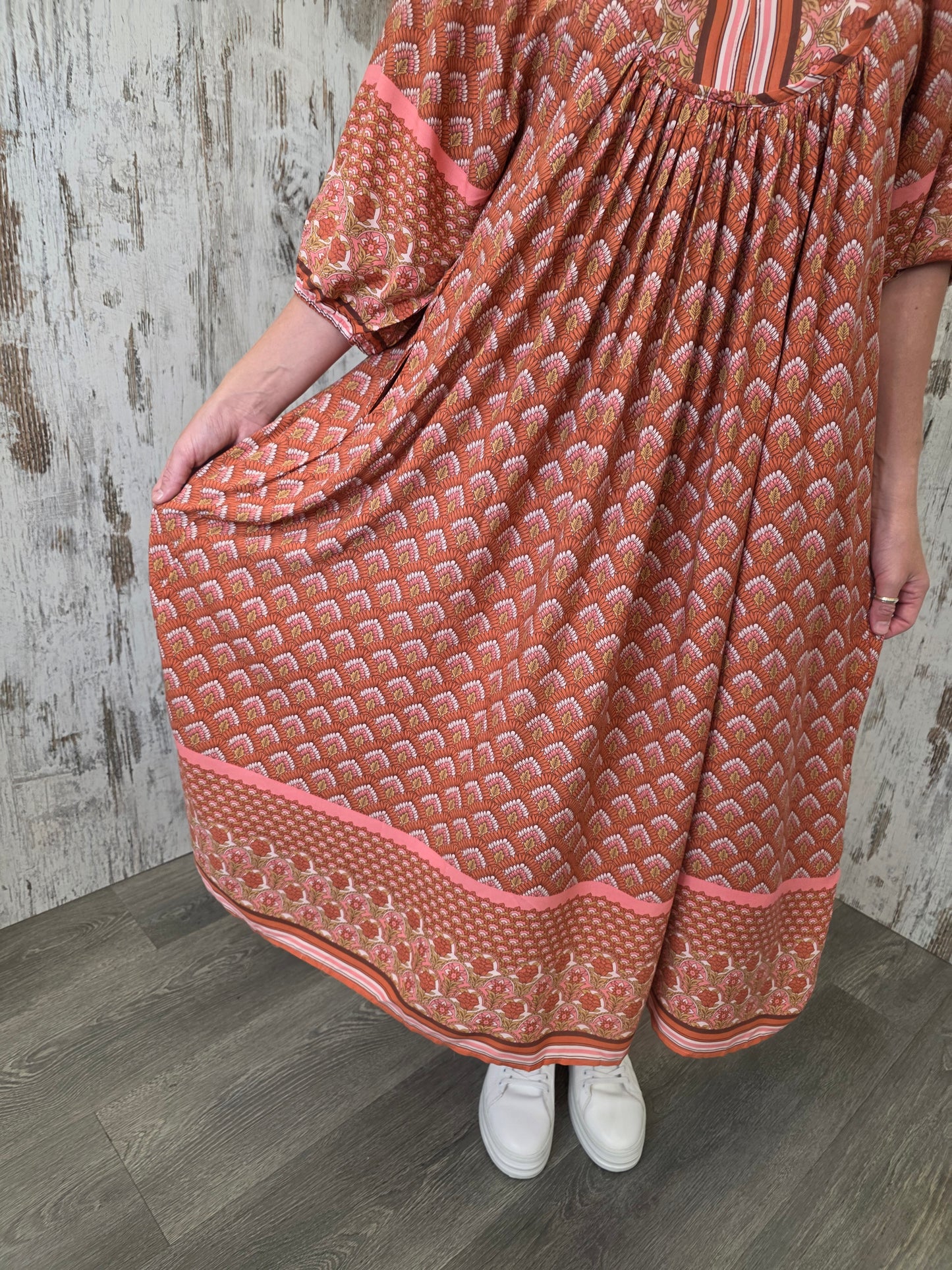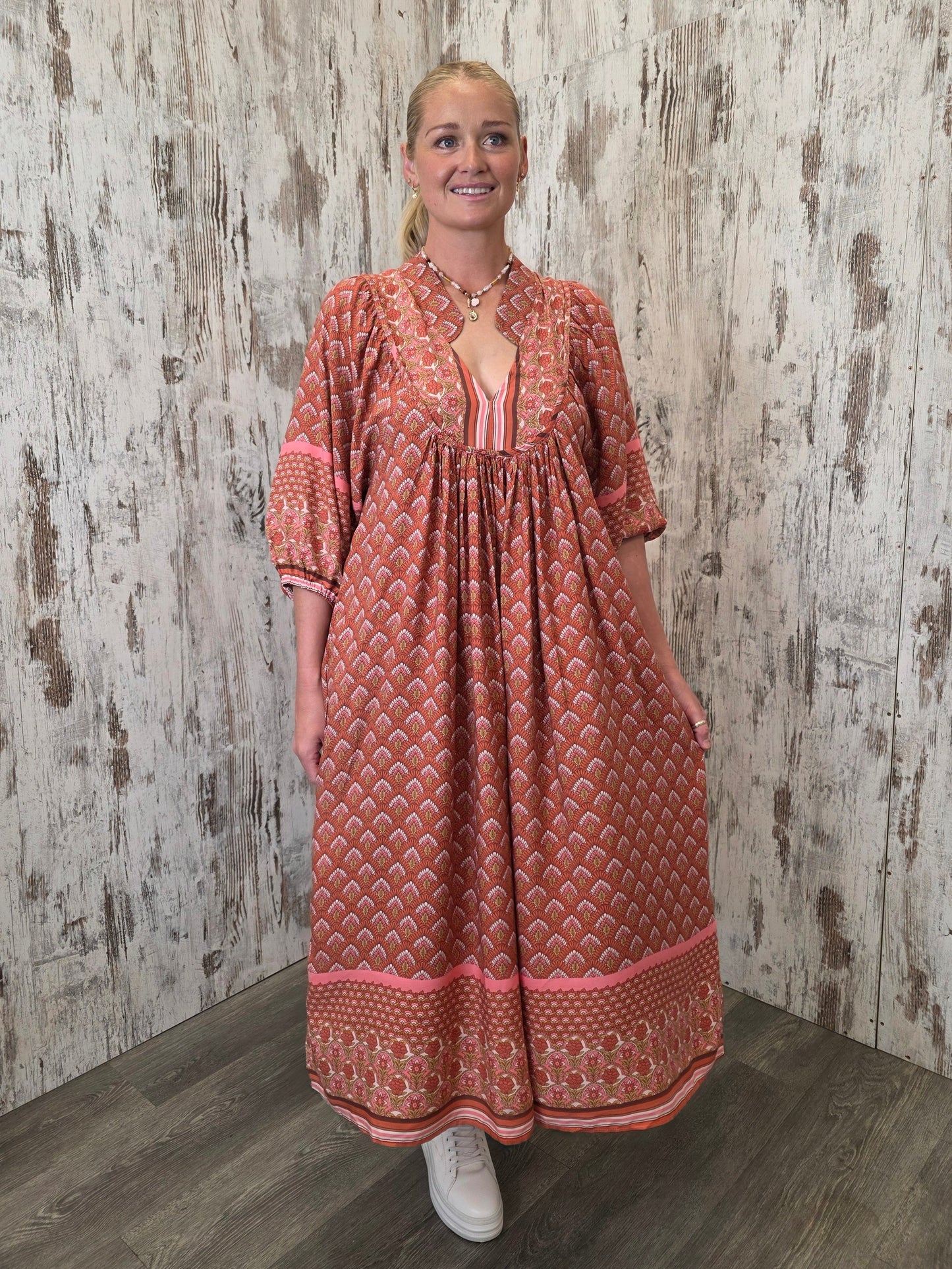 Jaase Boheme Midi Dress with Billowy Sleeve V-Neck Pockets - Coral Eden