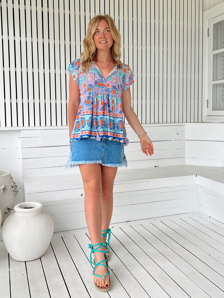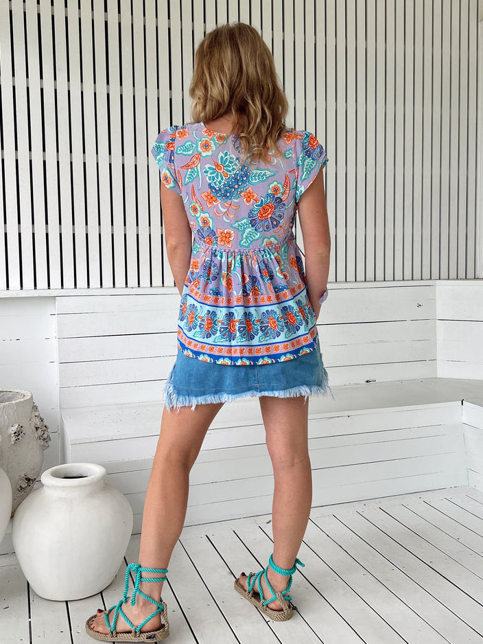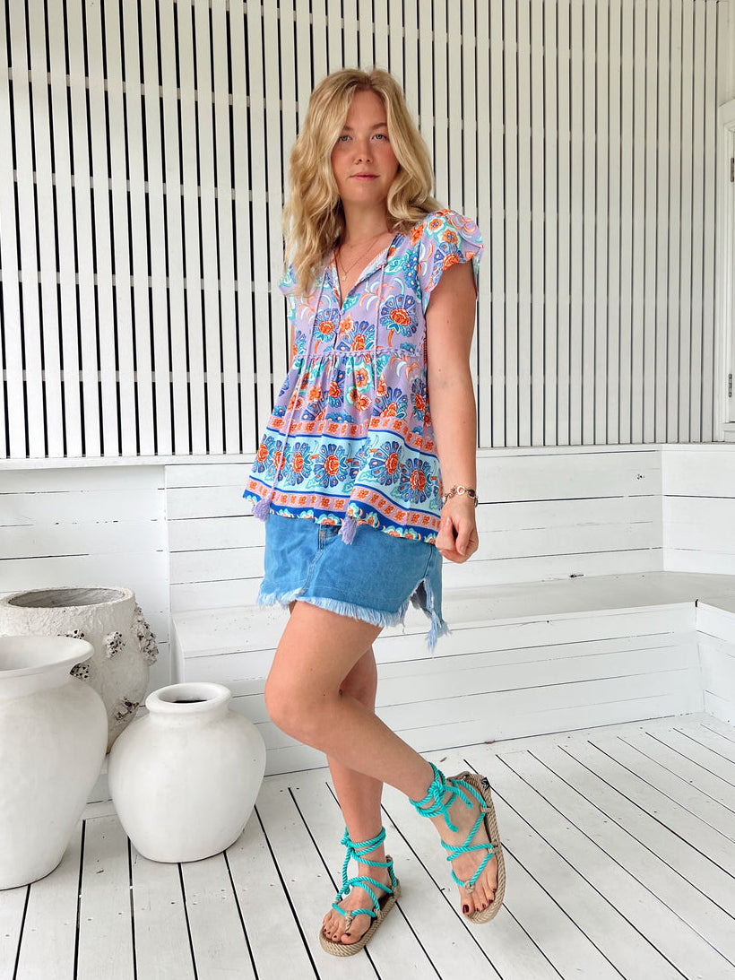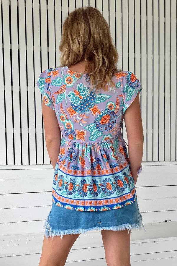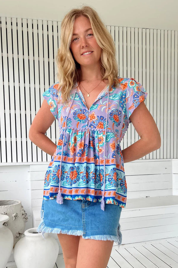 Ever so pretty with capped shell sleeves, the Ella blouse features a V-Neck in the most gorgeous Daydreamer print.