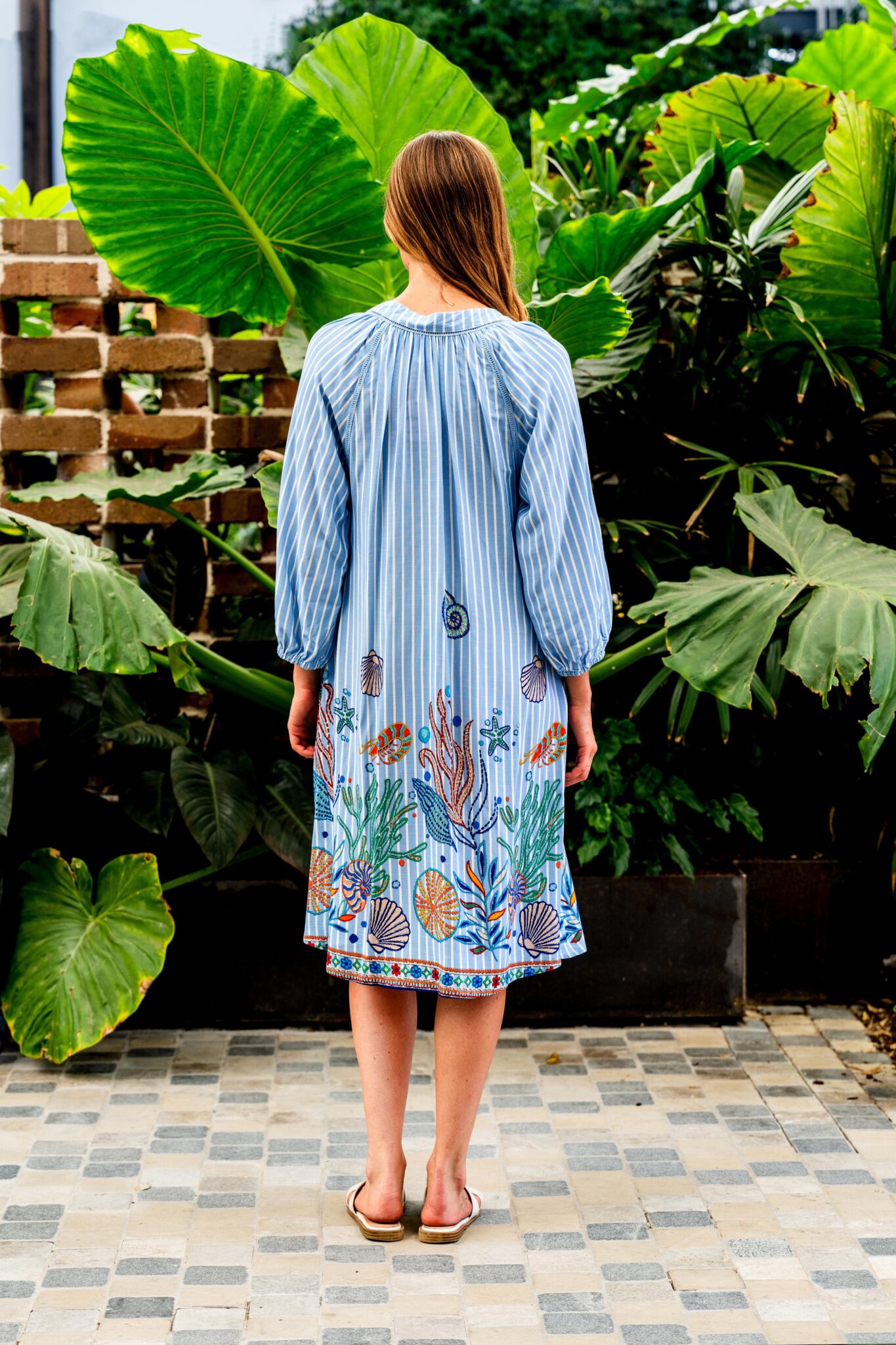 Boho Australia Seaworld Shirt Dress with Collar V-Neck Buttons Embroudery Detail - Blue Stripe