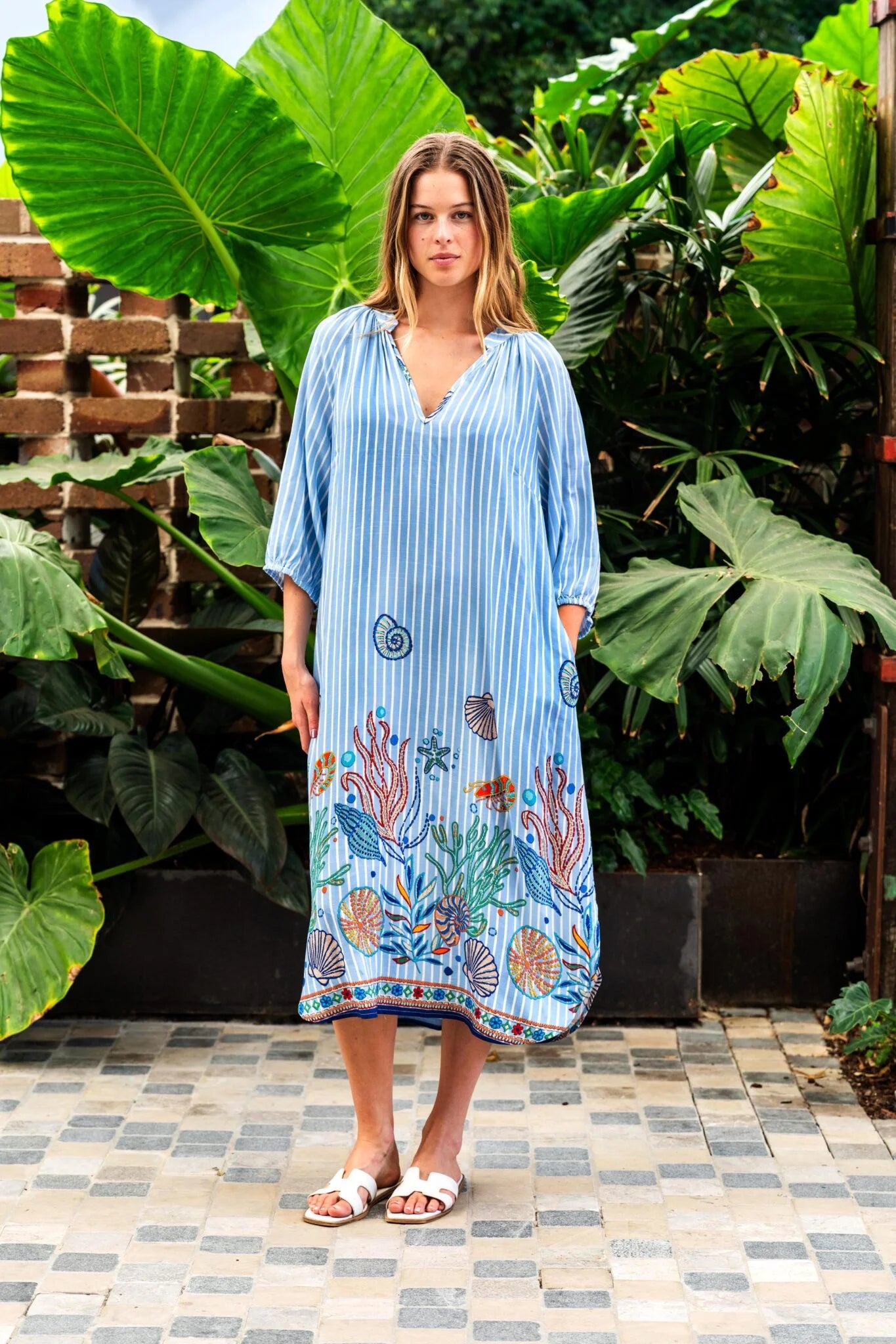 Boho Australia Sea World Shirt Midi Dress with V-Neck Pockets - Blue Striped