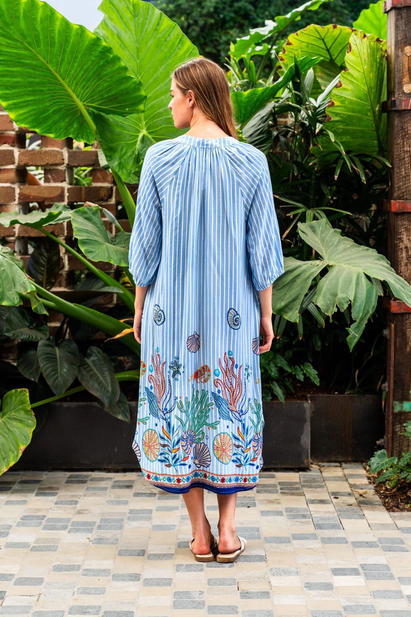 Boho Australia Seaworld Shirt Dress with Collar V-Neck Buttons Embroudery Detail - Blue Stripe