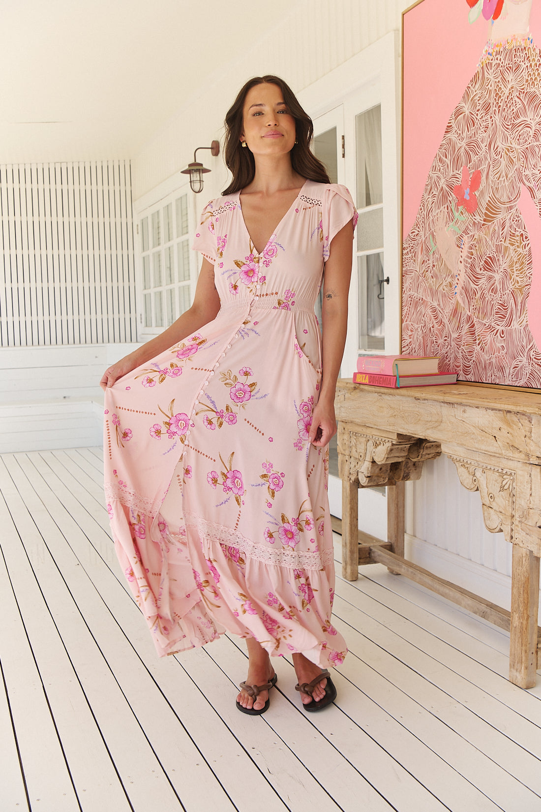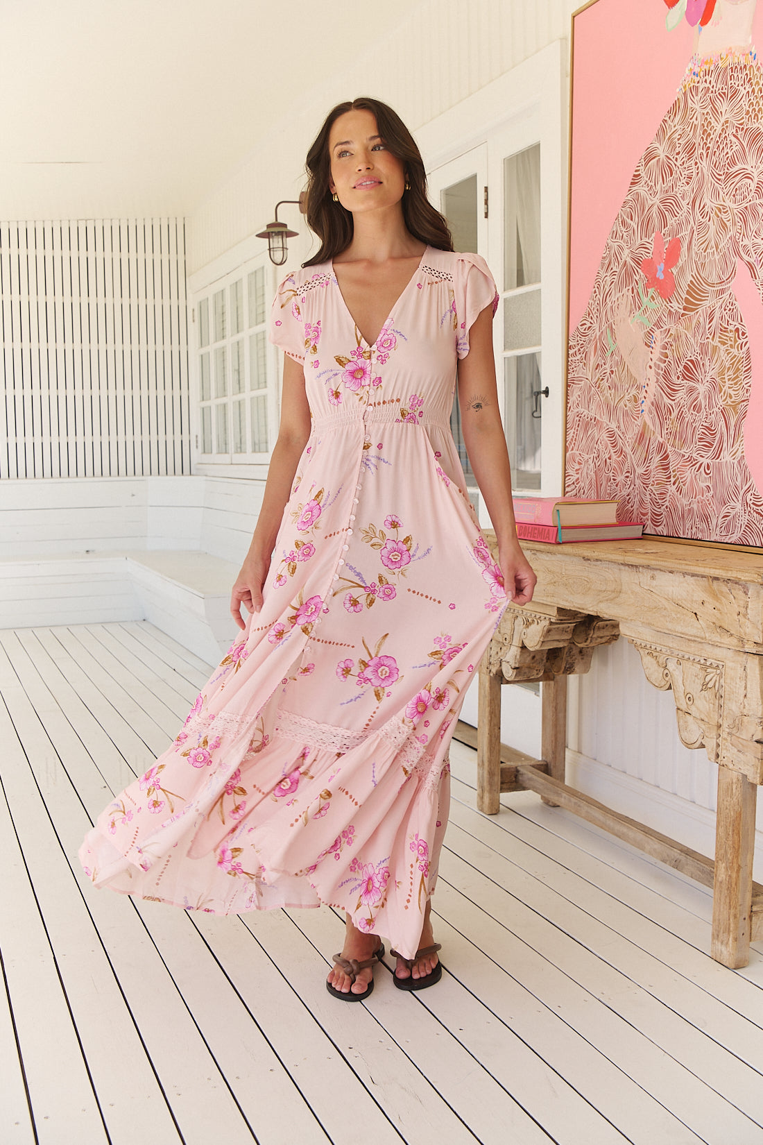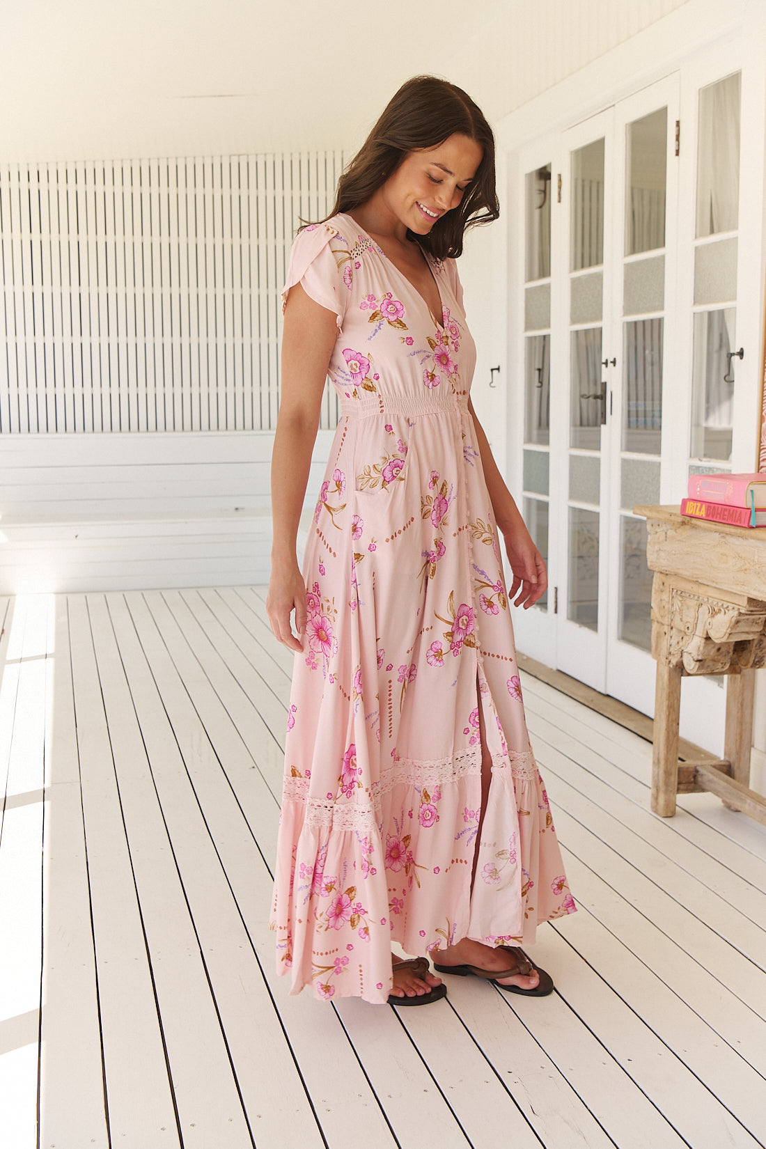 Jaase Carmen Maxi Dress with Cap Shell Sleeve V Neck Pockets Buttoned - Blushing Fields