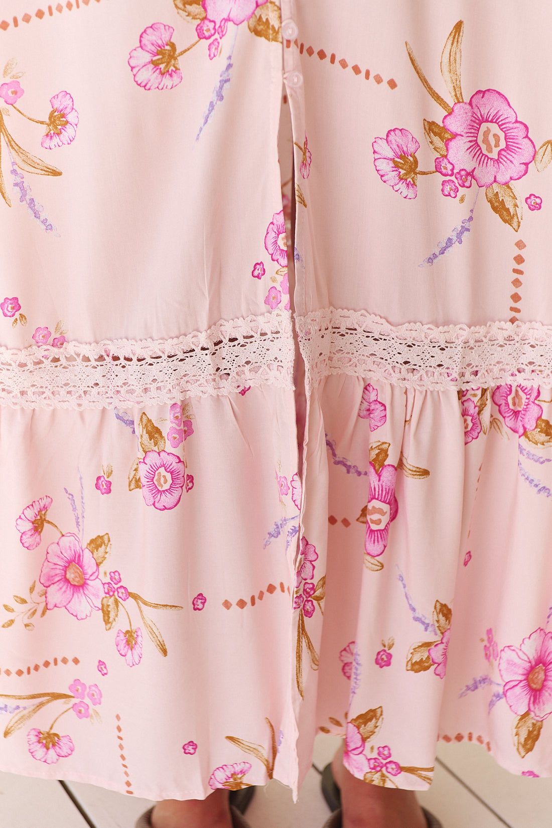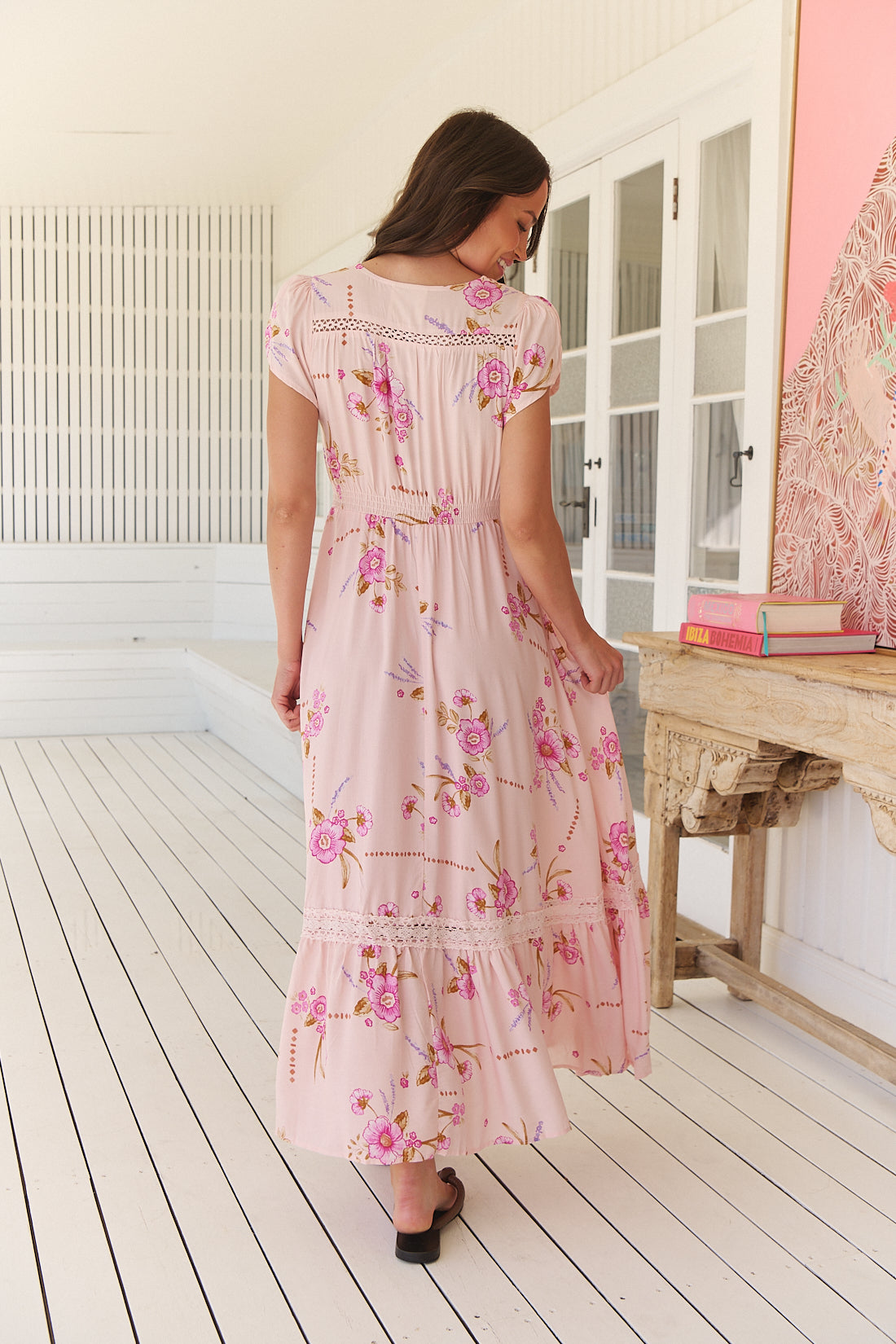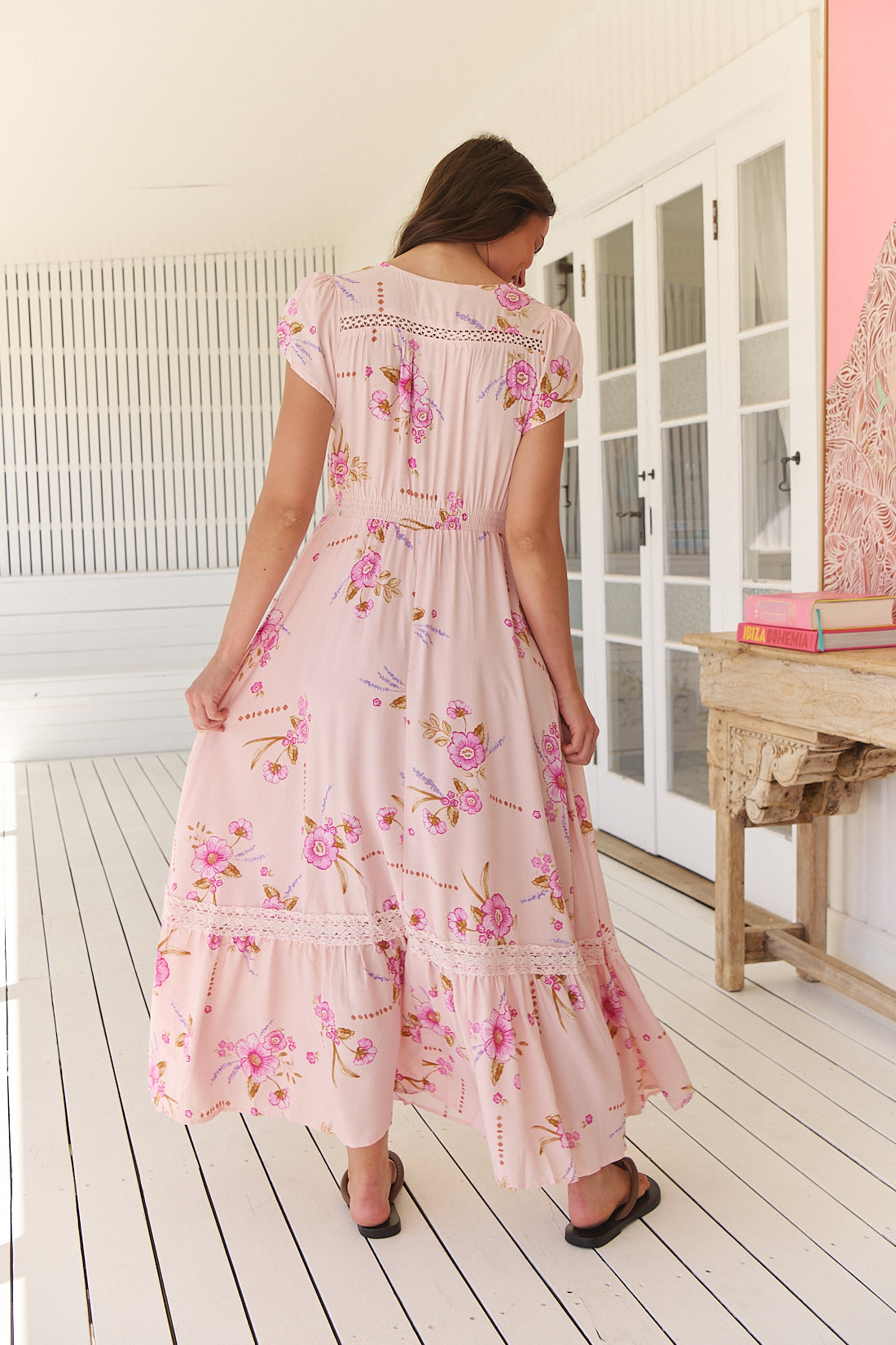 Jaase Carmen Maxi Dress with Cap Shell Sleeve V Neck Pockets Buttoned - Blushing Fields