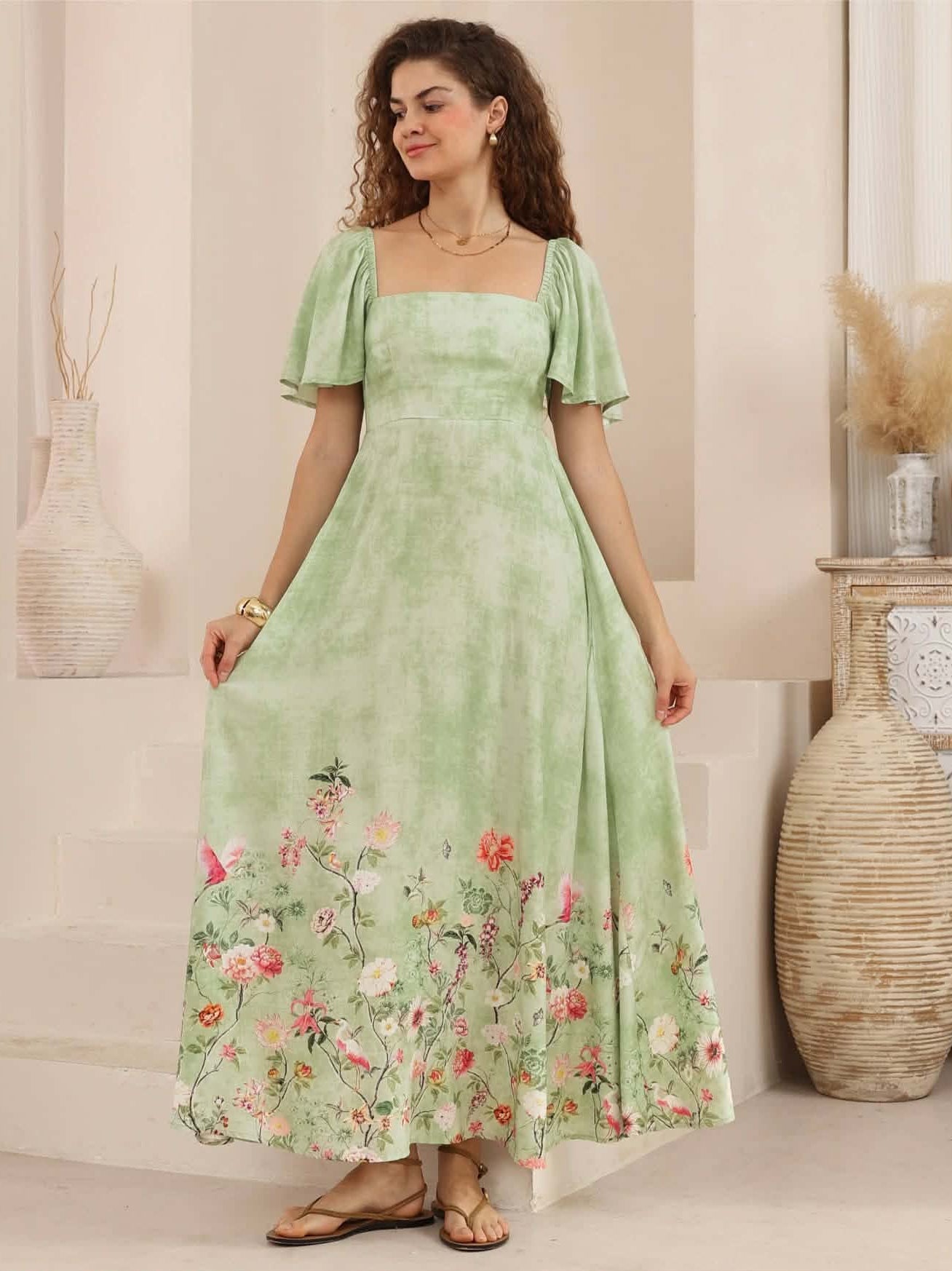 Iris Maxi Charlotte Maxi Dress with Shirred Bodice Flutter Sleeve - Laurel
