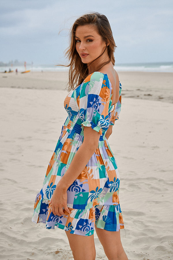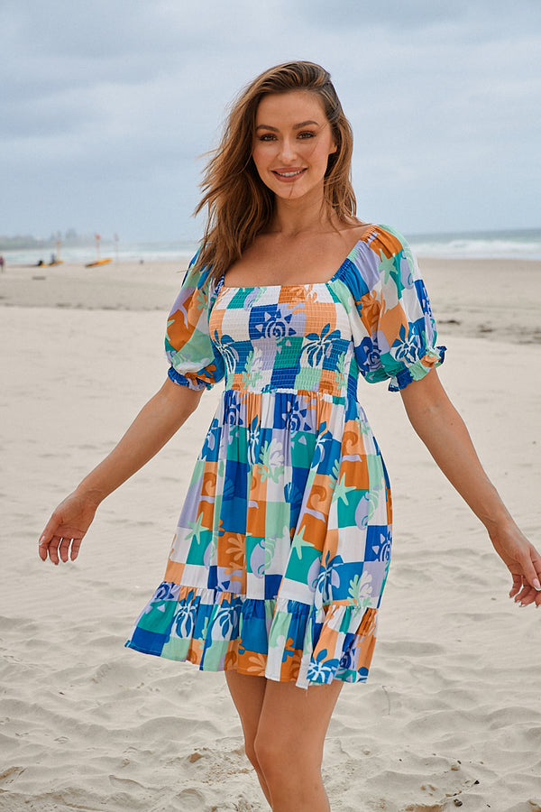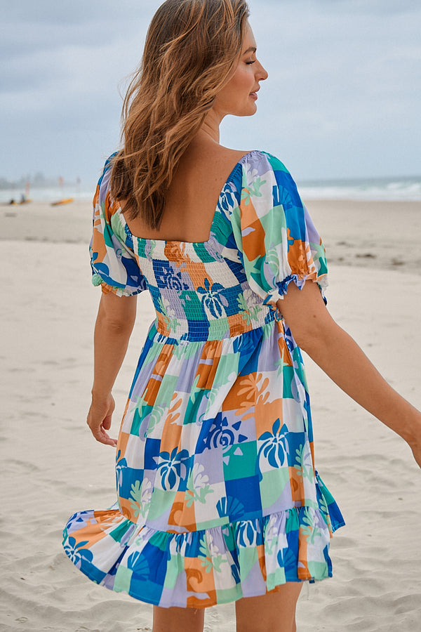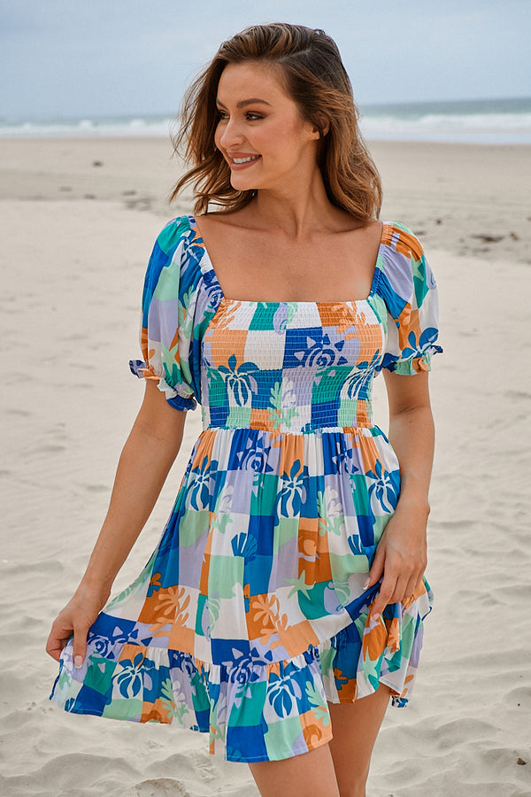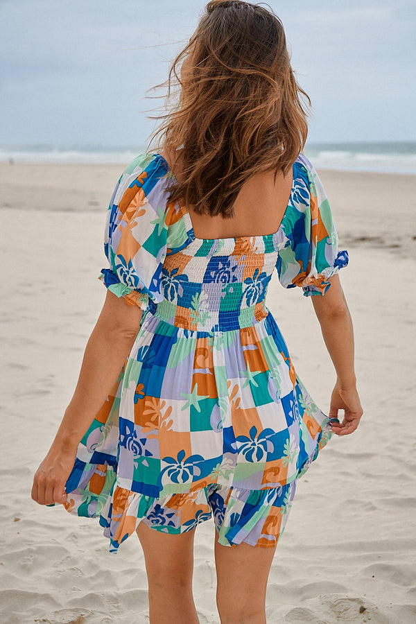 Jaase Louise Mini Dress with Square Neck Shirred Bodice - Tides - Style House Fashion Jaase