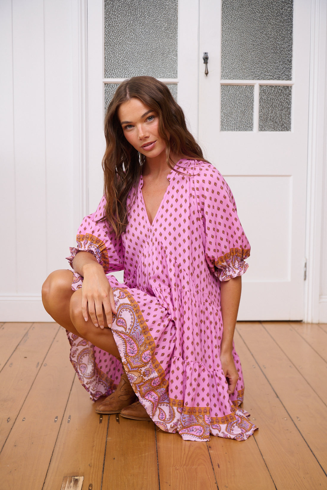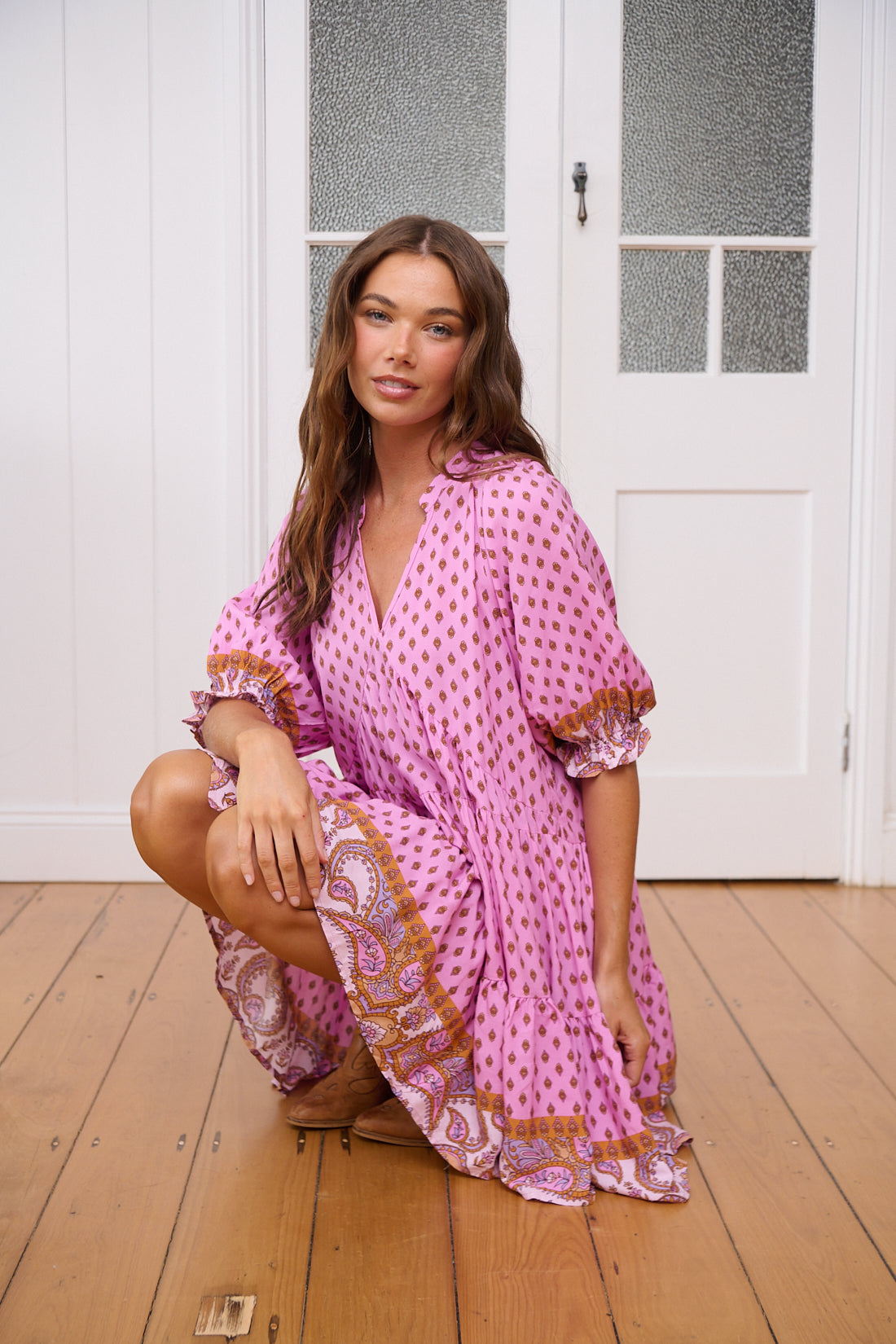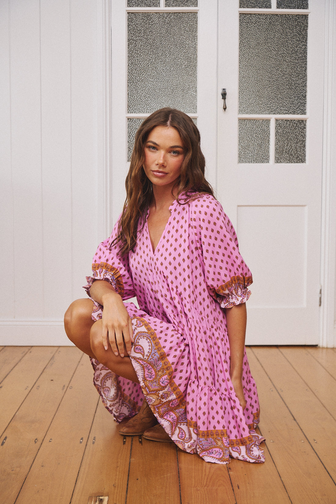 Featured in a gorgeous Venus floral fabrication with a v-neckline and comfortable floaty style you will adore. The Petal Mini is the perfect shape mini for all body shapes, super flattering and she also has pockets. Add some of our leather boots or white sneakers to finish of your look.