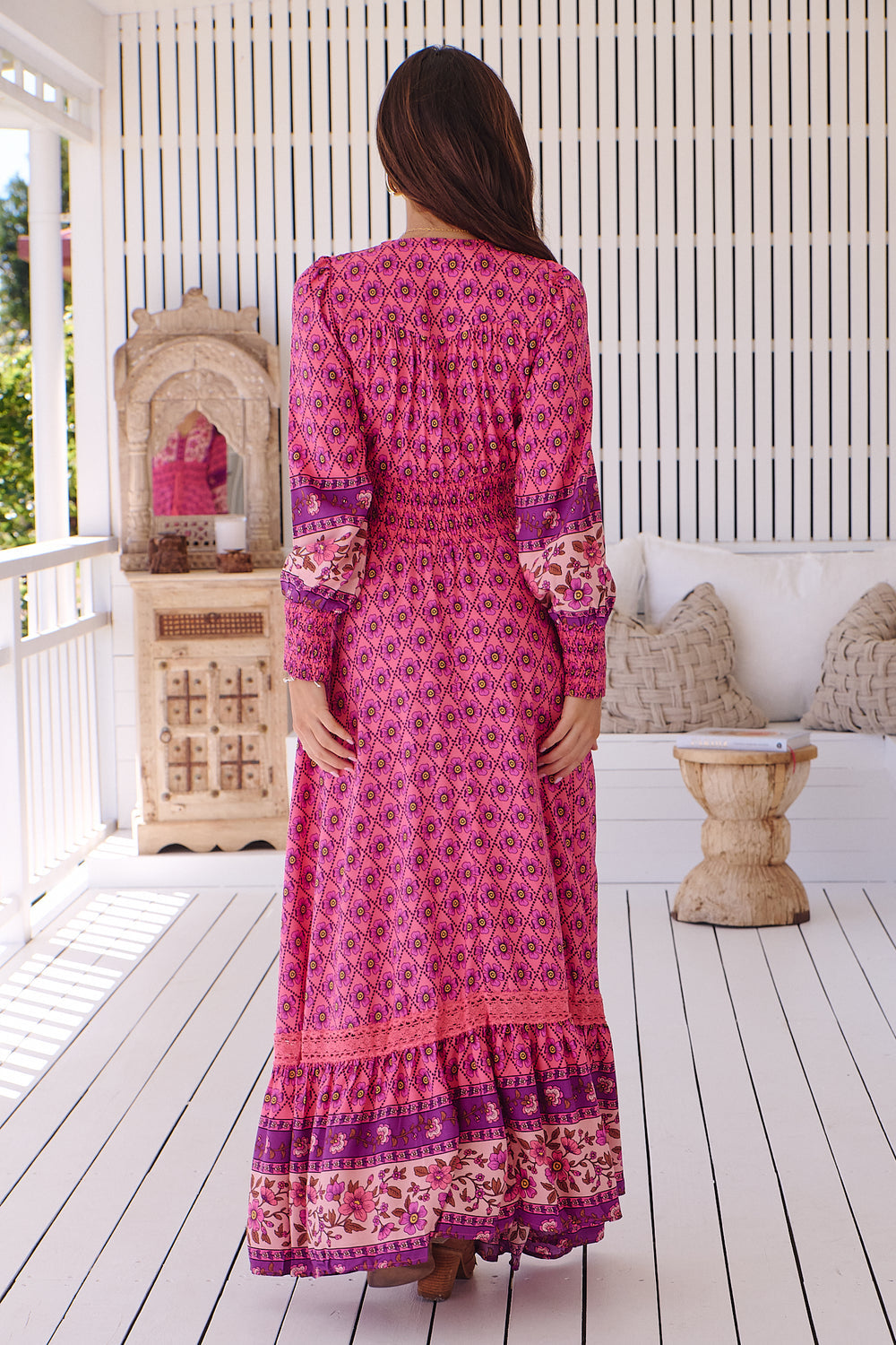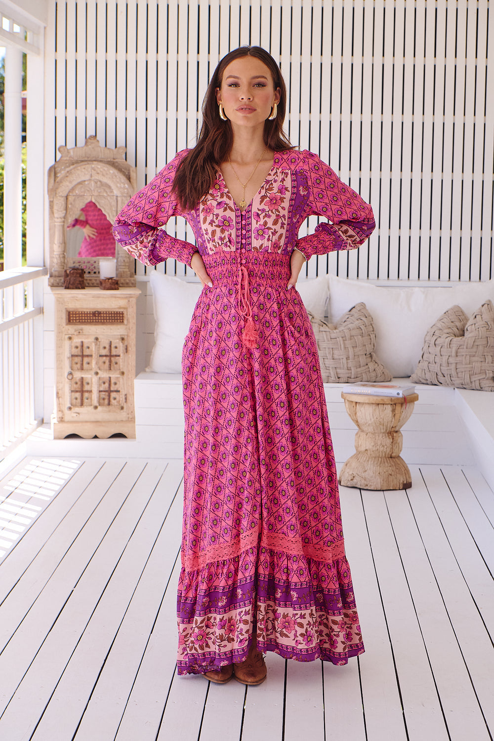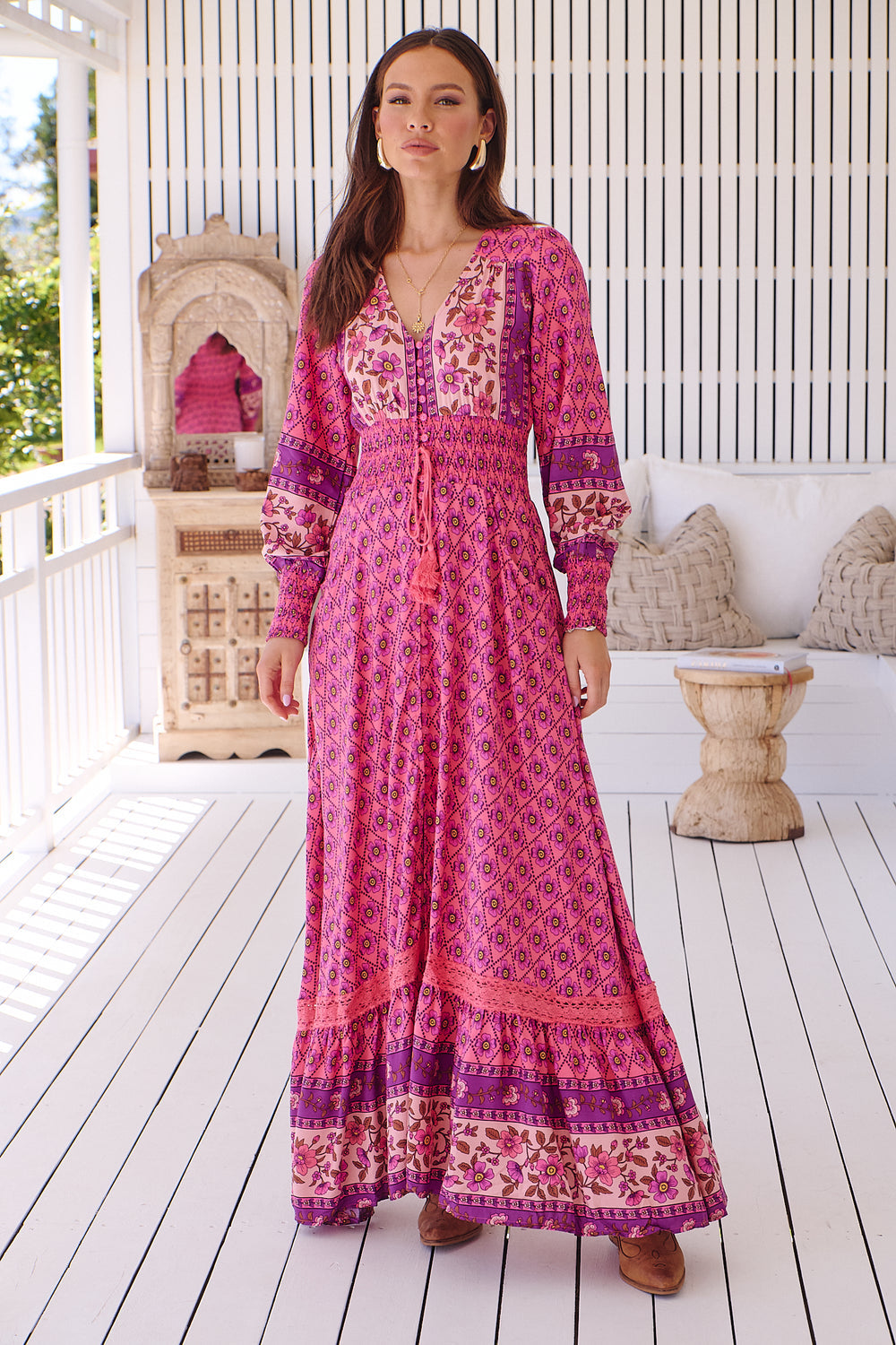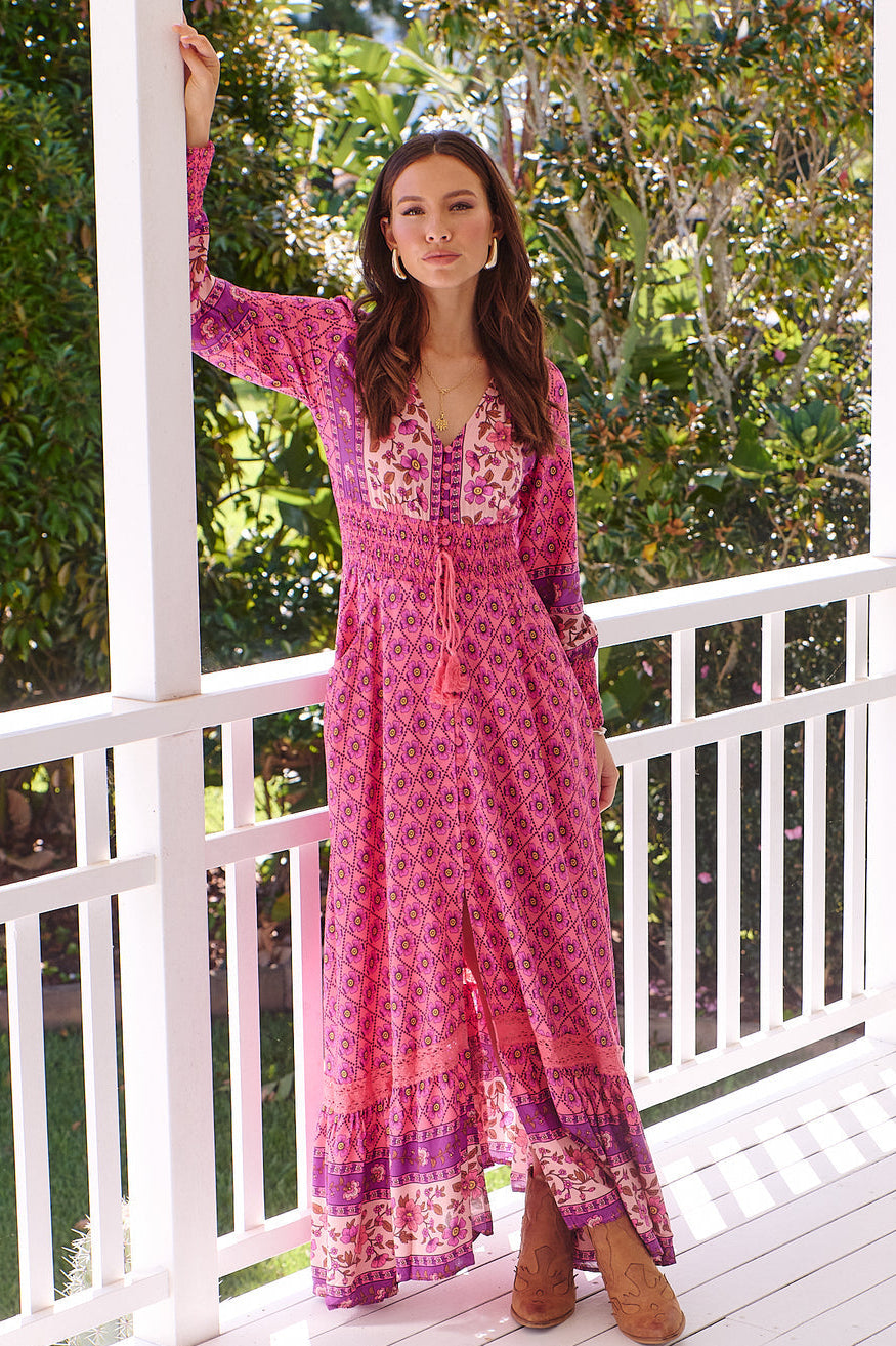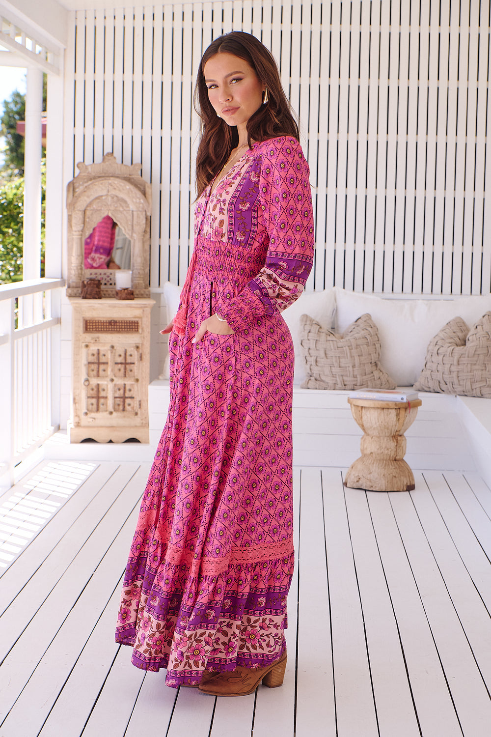 Jaase Sabrina Maxi Dress with V-Neck Buttoned Shirred Waist - Jolene
