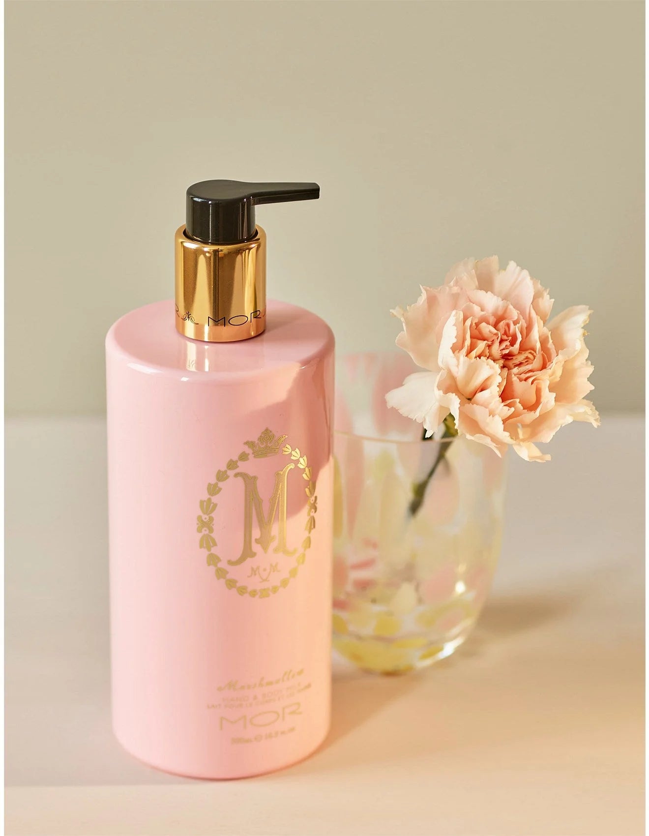 The Hand & Body Milk vessel is tinted in the signature Marshmallow pink and embellished with gold screen print & foil. The pump is coloured black with a gold over sleeve touched by a fine black embellishment.