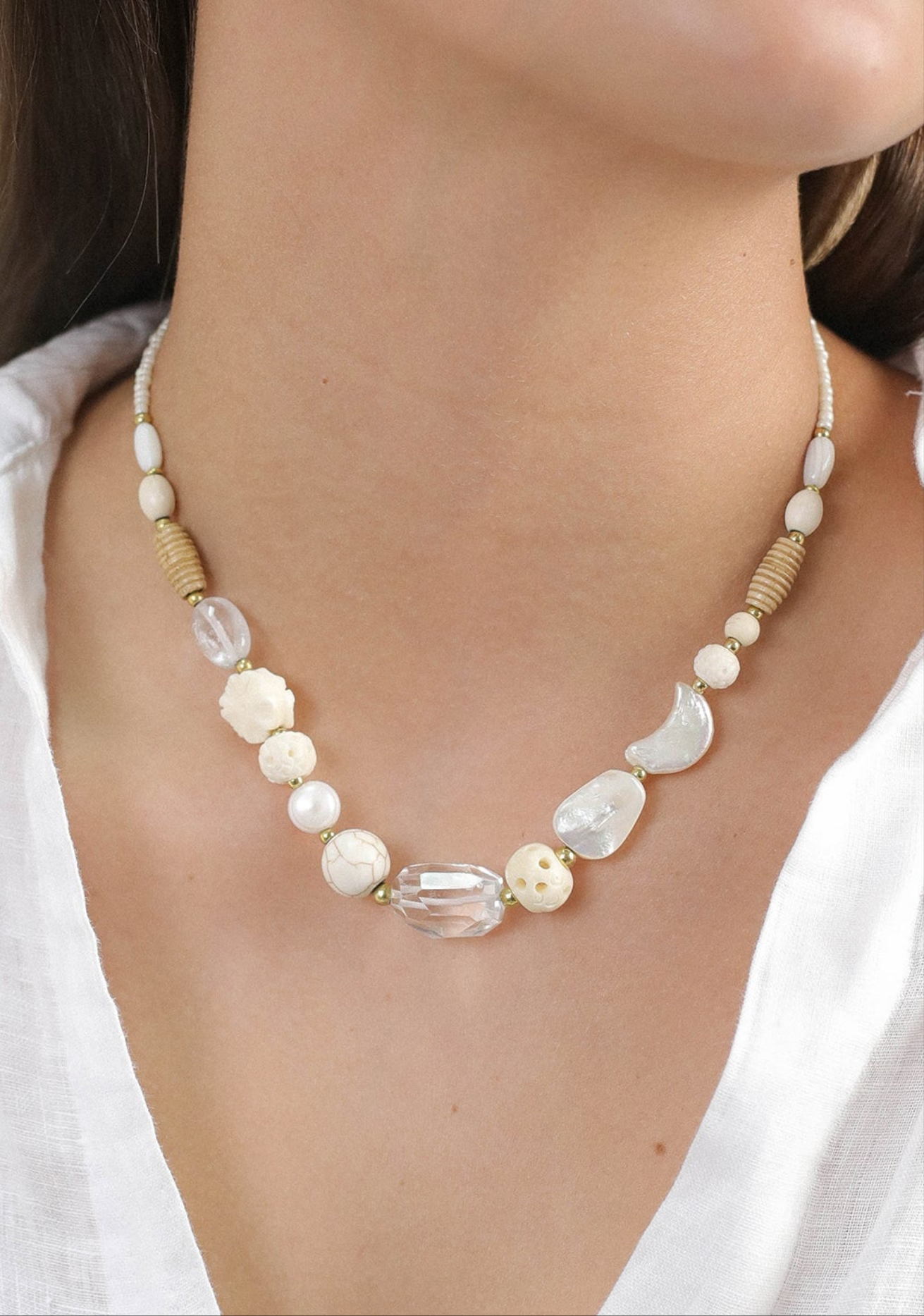 Composition: Brass, Coconut, Cotton Cord, Rock Crystal, Pearl, Bone, Howlite, Pink Shell,Agate, Bone, Rocaille beads, Golde,n MOP, Pearl, Howlite, Lettered Cone