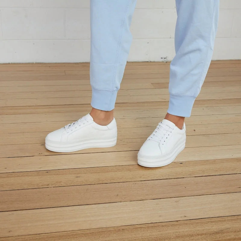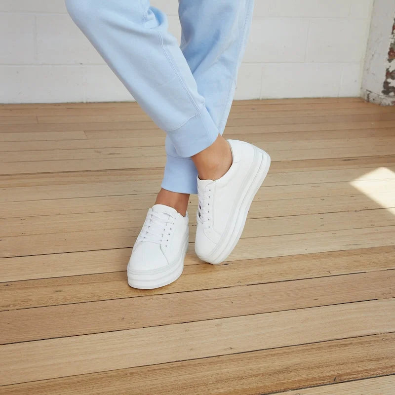 Welcome Oracle, an extension of the cult Alfie & Melbourne sneaker collection. Featuring a trendy double platform and shock absorbing outsole, this is our new favourite white sneaker to wear with everything. Fitted with our iconic removable memory foam/arch support leather innersole, these are friendly for most orthotics. Comfortable shoes can be cool! For those who have purchased Paradise or Pixie, these are the same weight despite the extra platform layer on the sole. When you’re feeling wild, swap into the leopard printed second shoelace in the shoebox!