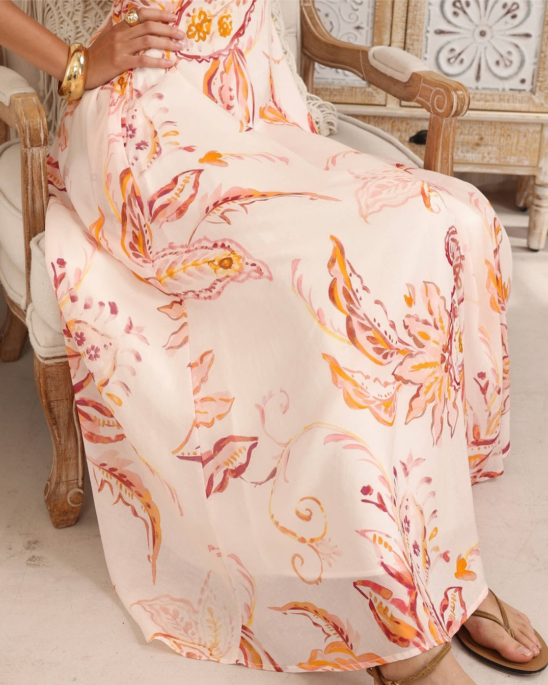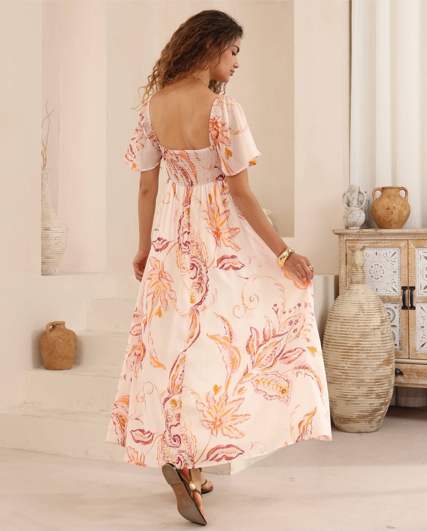 This Charlotte Maxi in the ROWAN print, features a shirred at back for a perfect fit. The flutter sleeves can be worn loosely on the shoulder or relaxed off the shoulder.