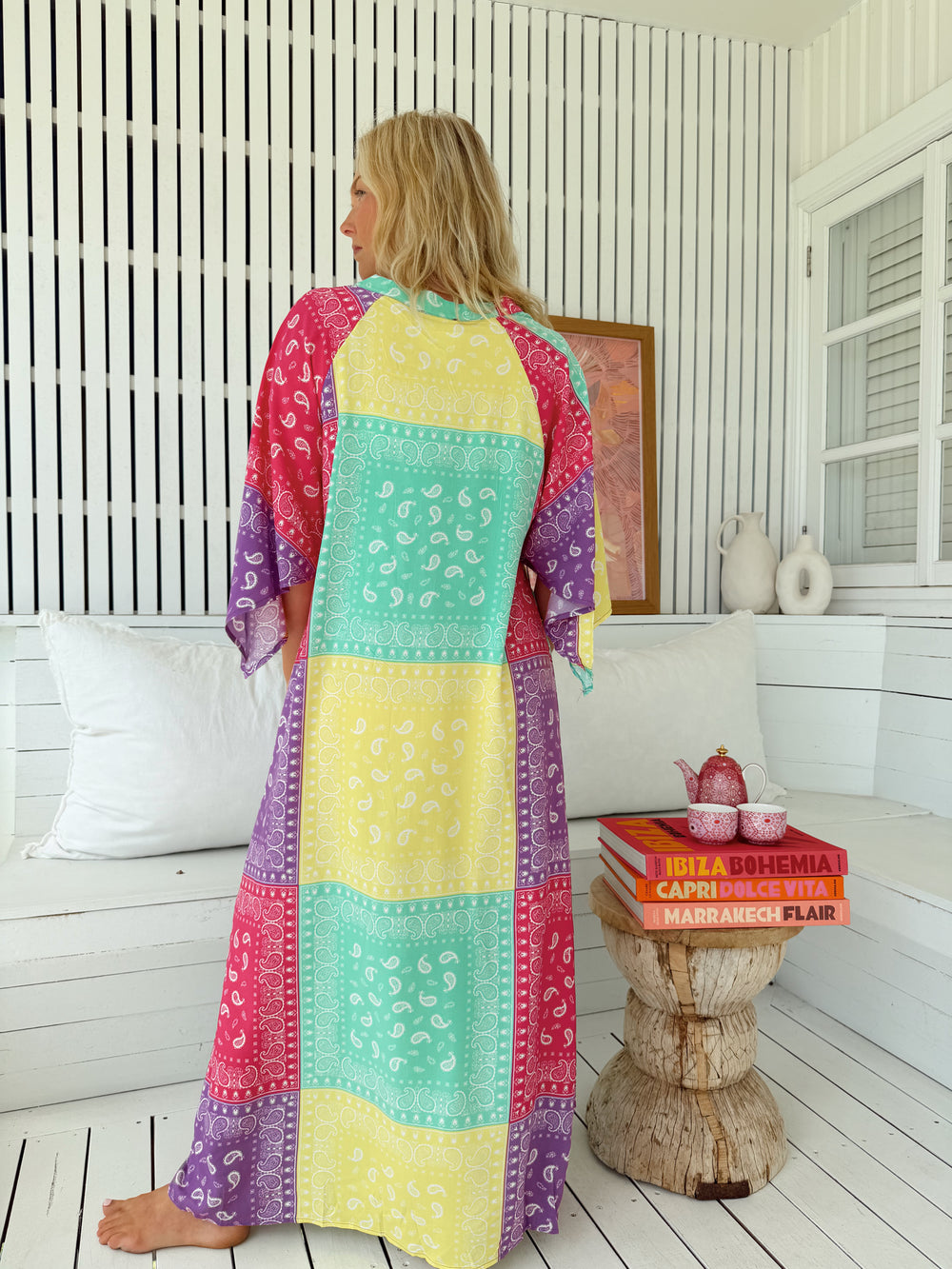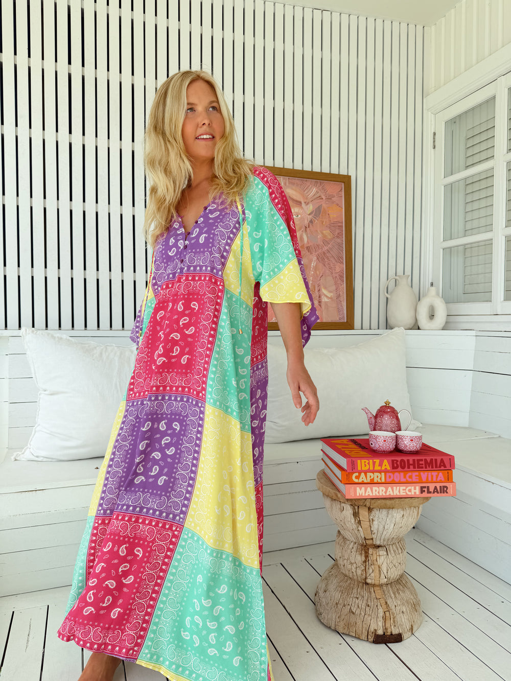 An essential Jaase piece, this effortless maxi dress features a vintage look block printing inspired border print floral. This free flowing shape featuring tie front detail and handkerchief sleeves for added shape. Team perfectly with our white Paradise sneakers for that perfect Boho Vintage Vibe.
