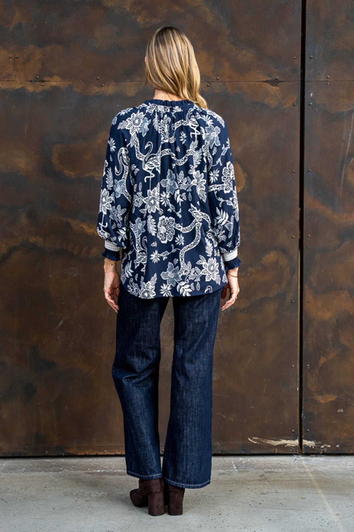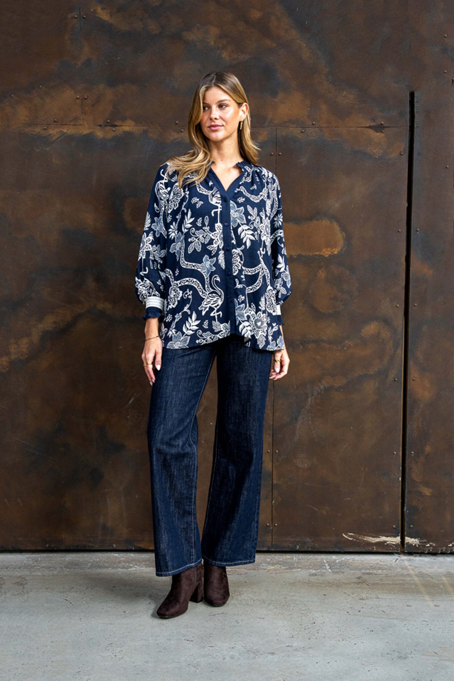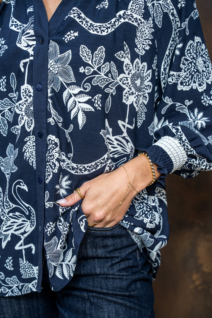 Boho Australia Reena Blouse with V-Neck Long Sleeve Shirred Cuff Buttoned - Navy Flourish