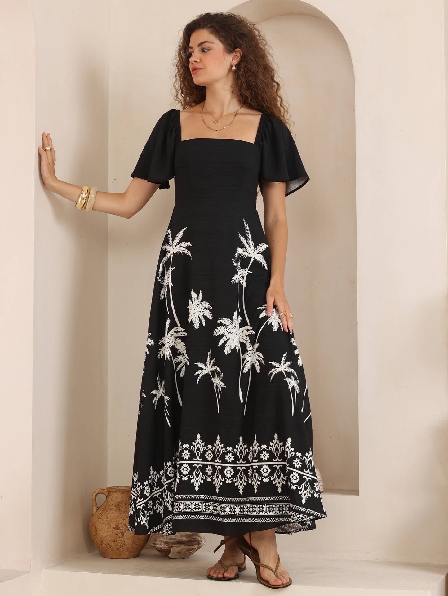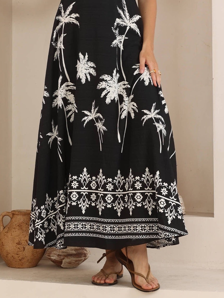 Iris Maxi Charlotte Maxi Dress with Shirred Bodice Flutter Sleeve - Midnight Palm - Style House Fashion