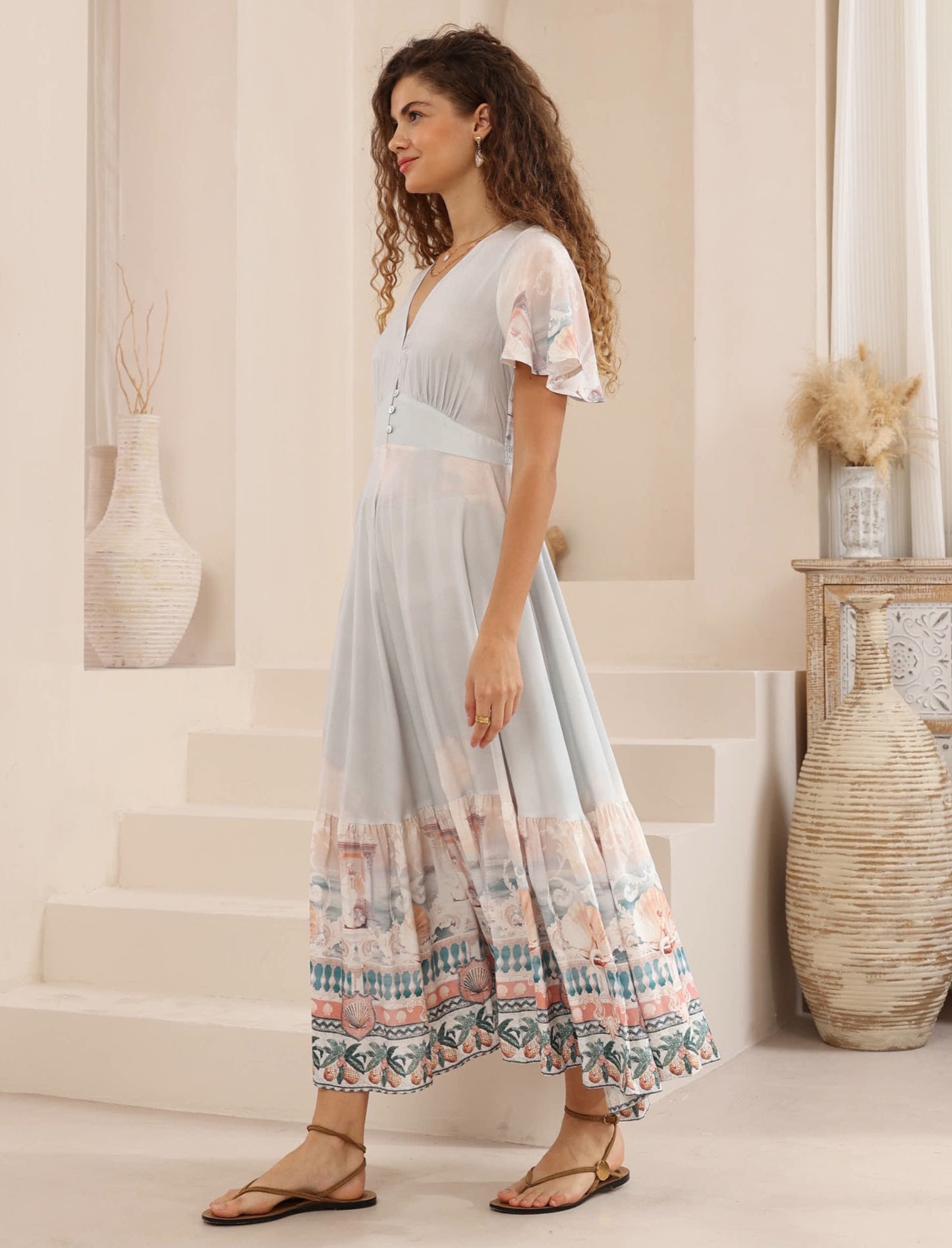 Iris Maxi Stacey Maxi Dress with V Neck Flutter Sleeve Empire Waist - Josephine