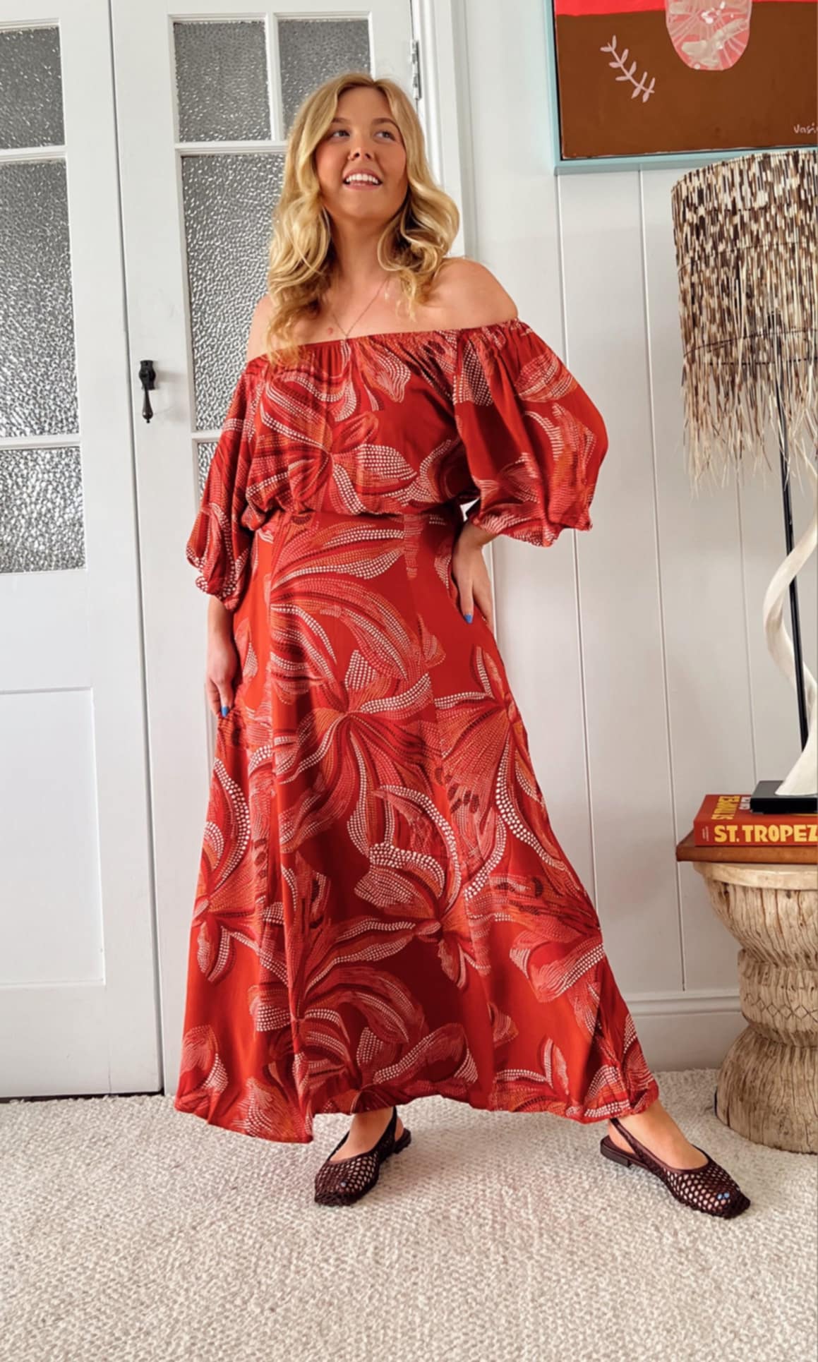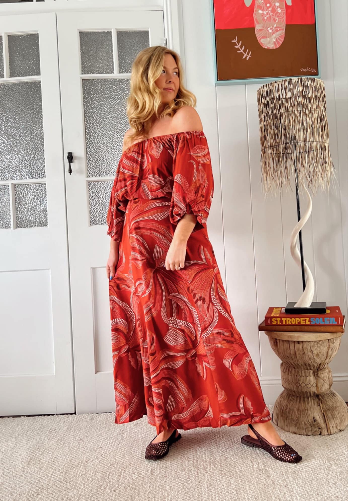 Featuring an off shoulder style, comfortable waist, puff sleeve with elastic cuff, and voluminous A-line maxi length skirt. The Hallie style will be both beautiful and comfortable. Designed in Australia, it's crafted from 100% Rayon for a luxurious feel. Rock the room in this statement piece!
